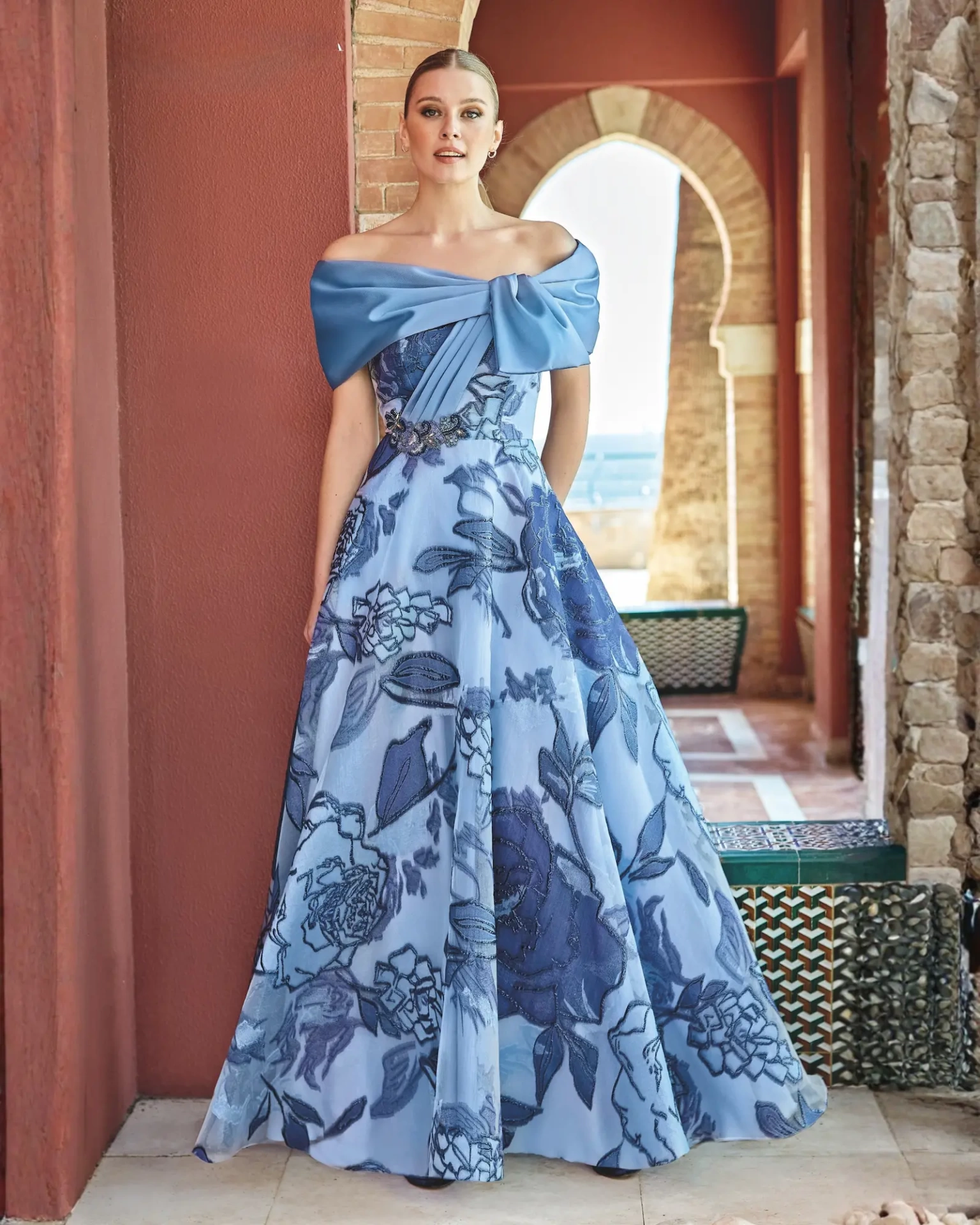 La silhouette ampia e fluida valorizza la figura con naturalezza, mentre il corpino strutturato è impreziosito da un raffinato motivo floreale che dona profondità e carattere al tessuto. Lo scollo off-shoulder è arricchito da un elegante drappeggio con nodo centrale, dettaglio couture che incornicia le spalle e illumina il décolleté con estrema femminilità. La vita è delicatamente sottolineata, creando un perfetto equilibrio tra struttura e leggerezza, mentre la gonna ampia accompagna il movimento con grande armonia.