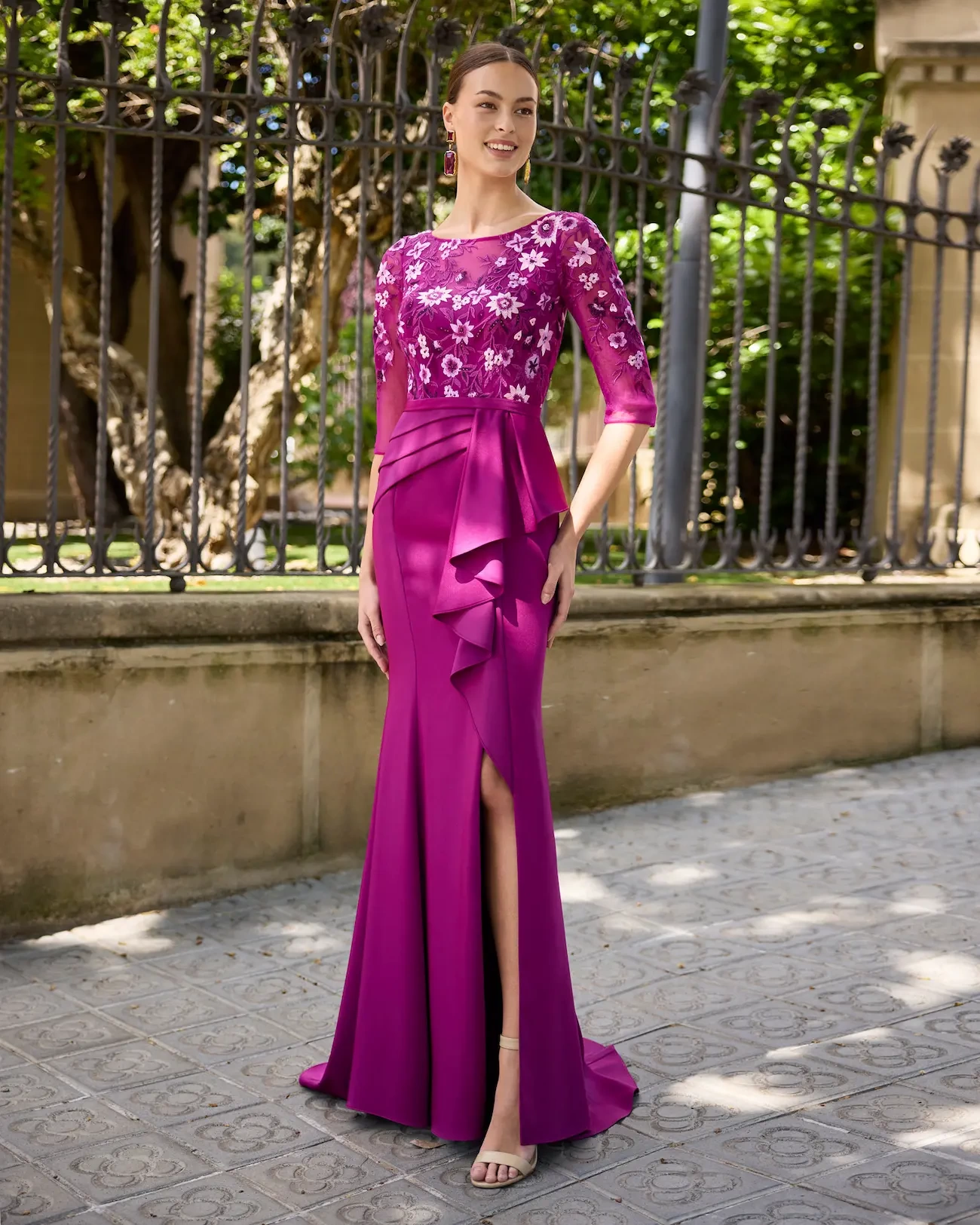 Questo raffinato abito da cerimonia unisce romanticismo e ricercatezza grazie al suo splendido corpino in tulle ricamato, impreziosito da delicati motivi floreali multicolore che donano luce, tridimensionalità e un’eleganza senza tempo. Le maniche a tre quarti, leggere e trasparenti, aggiungono un tocco di femminilità delicata, mantenendo il look armonioso e sofisticato. La gonna, realizzata in un crepe fluido e perfettamente strutturato, scivola con morbidezza lungo la silhouette e si apre in un elegante spacco frontale, ideale per slanciare la figura e aggiungere un tocco moderno al modello. Il punto vita è valorizzato da un raffinato drappeggio laterale con balze sovrapposte, che crea movimento e dona un’allure elegante e contemporanea. Il retro è pulito ed essenziale, con una vestibilità impeccabile che accompagna dolcemente le forme e termina con una gonna leggermente svasata, perfetta per ogni tipo di cerimonia formale.