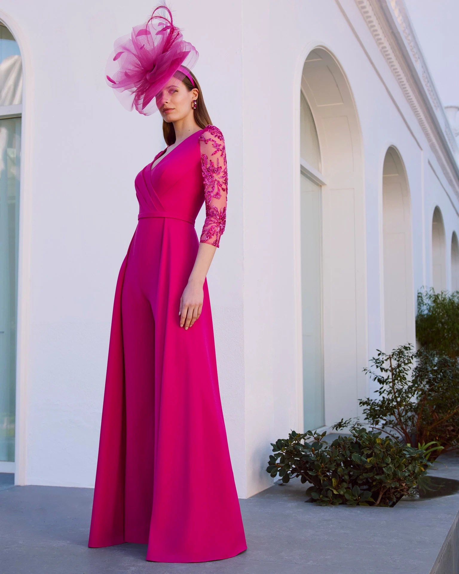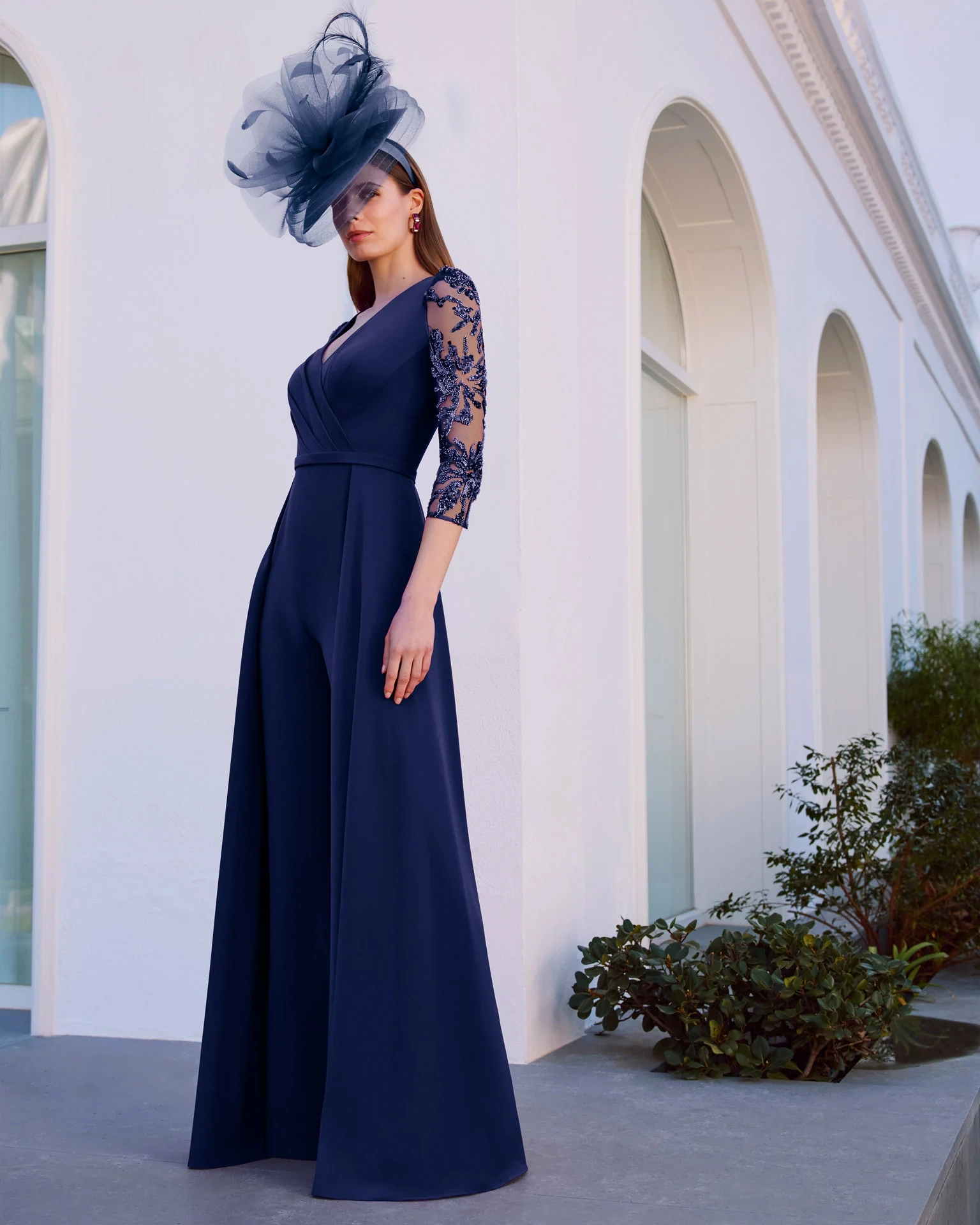 Questa splendida tuta da cerimonia unisce eleganza moderna e dettagli ricercati, creando un look sofisticato e impeccabile. Il corpino presenta un raffinato scollo a V incrociato, che valorizza il décolleté con armonia e dona slancio alla figura. Le maniche a tre quarti in tulle ricamato, arricchite da preziosi motivi floreali tono su tono, aggiungono un tocco luminoso e femminile, perfetto per le occasioni più speciali. La parte inferiore è caratterizzata da pantaloni ampi a palazzo, che scendono fluidi e donano movimento elegante ad ogni passo. La vestibilità è confortevole ma estremamente chic, ideale per chi desidera un’alternativa moderna al classico abito da cerimonia senza rinunciare alla raffinatezza. Il punto vita è definito da una cintura sottile che armonizza le proporzioni e valorizza la silhouette con discrezione.