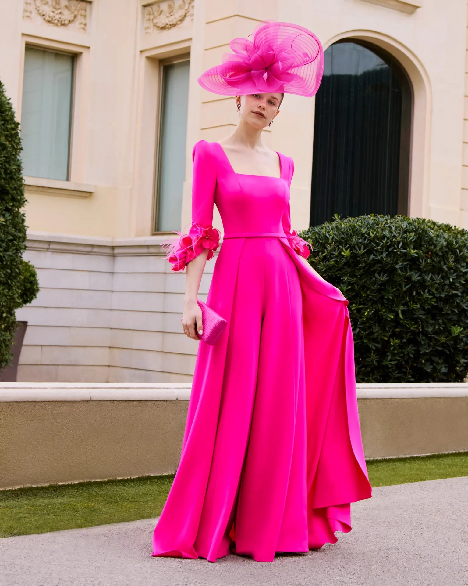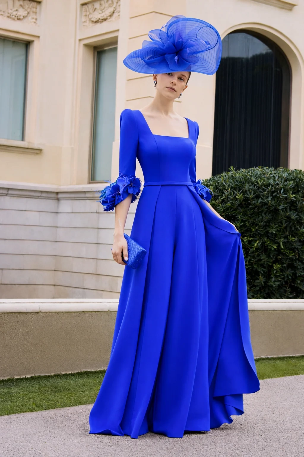 Questa splendida tuta da cerimonia con sopragonna unisce modernità, eleganza e un tocco couture che non passa inosservato. Il corpino presenta un raffinato scollo squadrato, pulito e contemporaneo, che valorizza il décolleté con grande armonia. Le maniche a tre quarti, leggermente strutturate, sono impreziosite da ricercate applicazioni floreali e leggere piume tono su tono: un dettaglio che dona tridimensionalità e femminilità, trasformando l’intero look in qualcosa di davvero unico. La parte inferiore è composta da una tuta palazzo, ampia e fluida, che slancia la figura e garantisce una vestibilità impeccabile. A completare il modello, una sopragonna lunga realizzata nello stesso tessuto, che scivola elegantemente lungo il corpo creando volume, movimento e un effetto scenografico a ogni passo. La cintura sottile in vita definisce la silhouette e unisce con naturalezza la struttura superiore alla fluidità della parte inferiore. Sul retro, una delicata scollatura a V aggiunge un tocco di grazia e leggerezza, mentre la sopragonna cade morbida fino al pavimento, lasciando intravedere il taglio moderno della tuta.