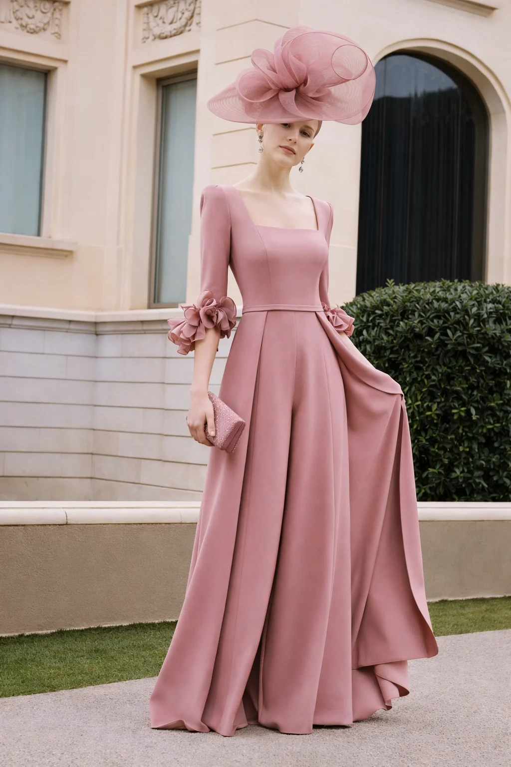 Questa splendida tuta da cerimonia con sopragonna unisce modernità, eleganza e un tocco couture che non passa inosservato. Il corpino presenta un raffinato scollo squadrato, pulito e contemporaneo, che valorizza il décolleté con grande armonia. Le maniche a tre quarti, leggermente strutturate, sono impreziosite da ricercate applicazioni floreali e leggere piume tono su tono: un dettaglio che dona tridimensionalità e femminilità, trasformando l’intero look in qualcosa di davvero unico. La parte inferiore è composta da una tuta palazzo, ampia e fluida, che slancia la figura e garantisce una vestibilità impeccabile. A completare il modello, una sopragonna lunga realizzata nello stesso tessuto, che scivola elegantemente lungo il corpo creando volume, movimento e un effetto scenografico a ogni passo. La cintura sottile in vita definisce la silhouette e unisce con naturalezza la struttura superiore alla fluidità della parte inferiore. Sul retro, una delicata scollatura a V aggiunge un tocco di grazia e leggerezza, mentre la sopragonna cade morbida fino al pavimento, lasciando intravedere il taglio moderno della tuta.