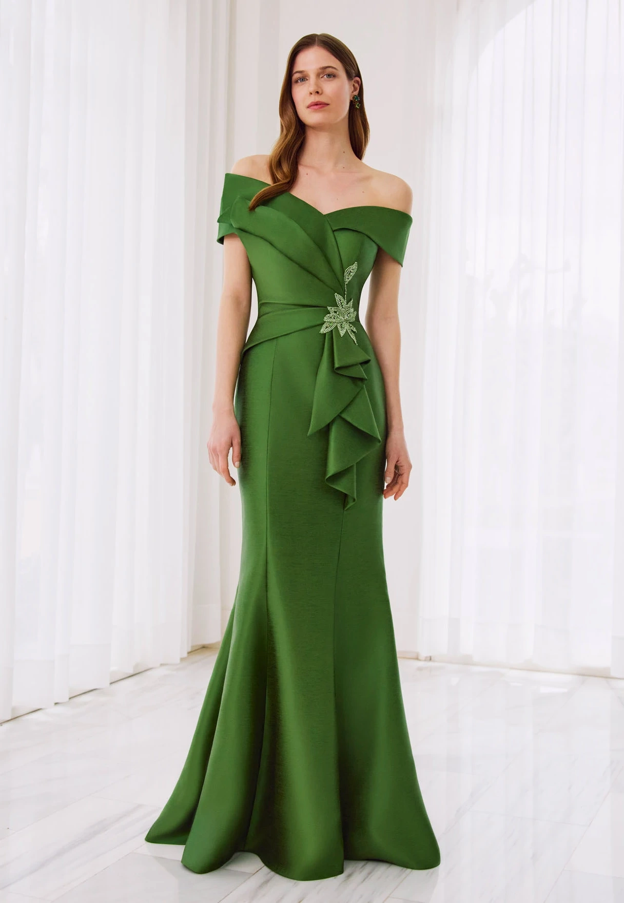 Questo abito da cerimonia in un raffinato verde olmo conquista per la sua linea morbida ma strutturata, pensata per valorizzare con naturalezza la silhouette. Lo scollo a spalle scoperte incornicia il décolleté con un tocco sofisticato, mentre il corpino drappeggiato crea giochi di pieghe armoniosi che slanciano la figura.Il punto vita è impreziosito da un’applicazione gioiello e da una cascata di volant laterali che regalano movimento e femminilità, accompagnando la linea della gonna che scende morbida fino al pavimento.