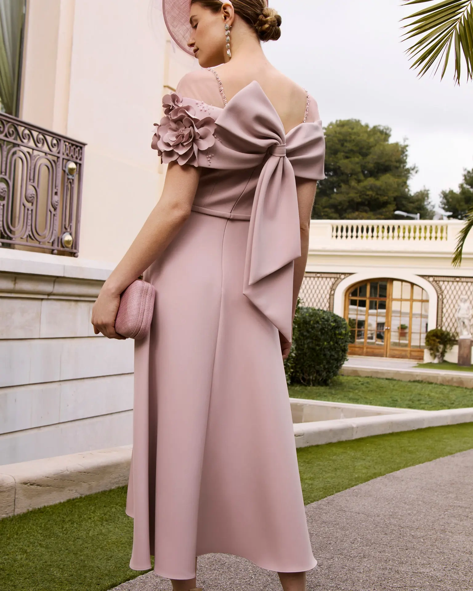 Un abito da cerimonia che unisce femminilità e ricercatezza in un equilibrio perfetto. Il corpetto presenta uno scollo off-shoulder strutturato, impreziosito da sottili spalline gioiello e applicazioni floreali tridimensionali tono su tono, che donano movimento e un tocco couture al design. La linea è morbida e fluida, con una gonna midi che accompagna la figura con eleganza, valorizzando il punto vita. Sul retro, un raffinato fiocco oversize diventa protagonista, aggiungendo un dettaglio scenografico e sofisticato che rende l’abito unico anche visto da dietro. Realizzato in un tessuto liscio e confortevole, è la scelta ideale per cerimonie diurne o serali, matrimoni, eventi eleganti e occasioni speciali in cui distinguersi con stile. Un modello pensato per la donna che ama l’eleganza senza tempo, arricchita da dettagli sartoriali di grande personalità.