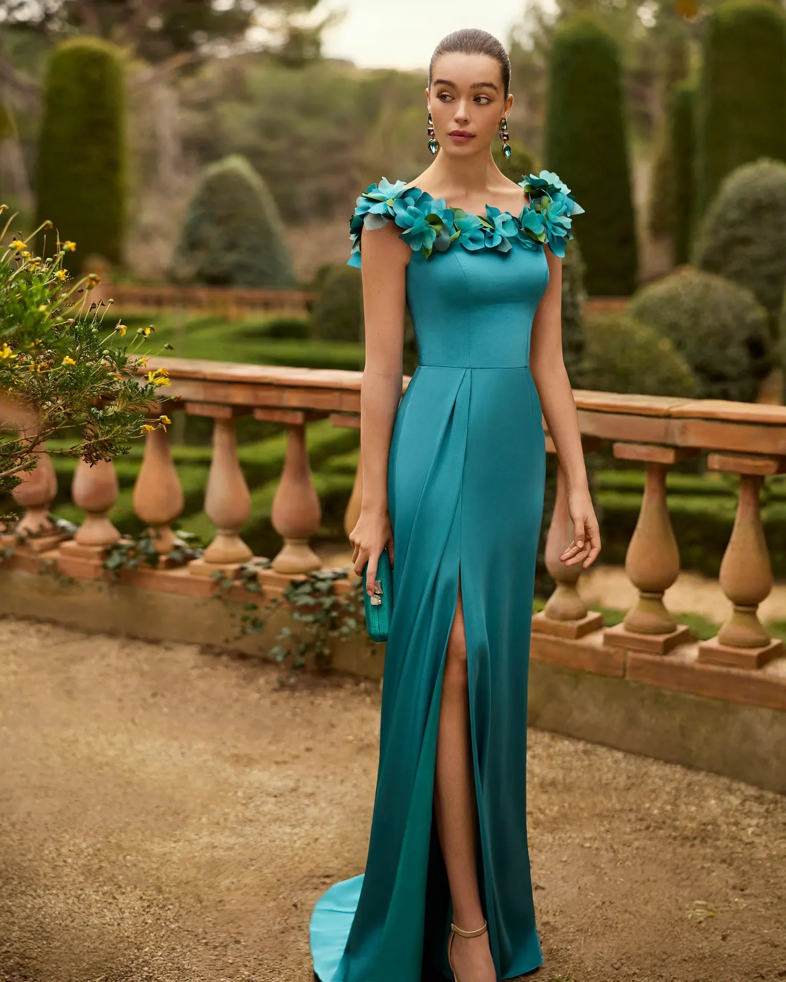 Un abito sofisticato e scenografico, pensato per chi desidera un look elegante ma ricco di personalità. Il corpino, dalla linea pulita e scivolata, è impreziosito da un’incantevole applicazione di fiori 3D che avvolge le spalle: un dettaglio couture che dona volume e un tocco di romanticismo contemporaneo.La gonna lunga presenta uno spacco frontale che slancia la figura e aggiunge un tocco moderno senza perdere classe. Il taglio aderente sottolinea dolcemente la silhouette, mentre il tessuto fluido garantisce comfort e armonia nei movimenti.