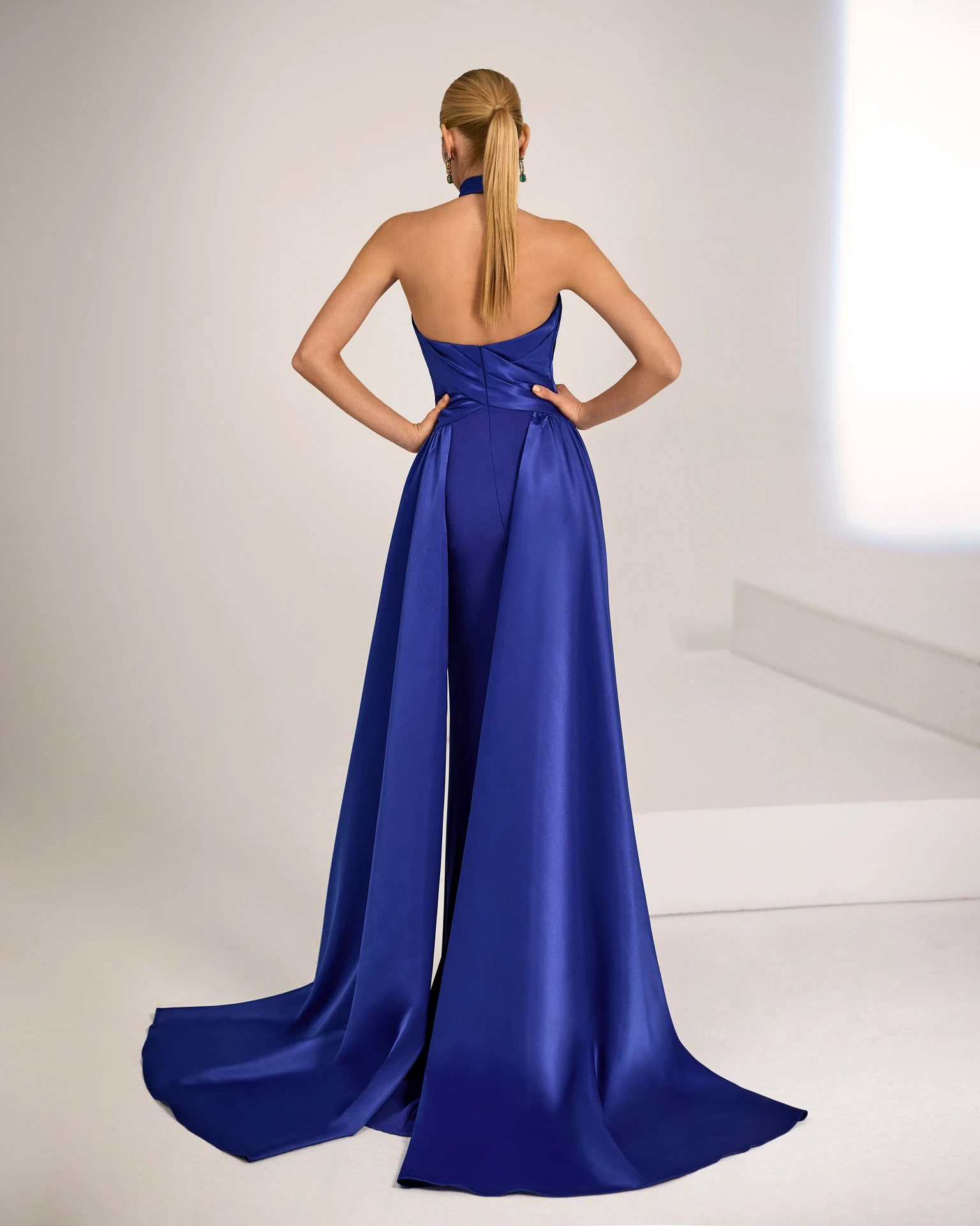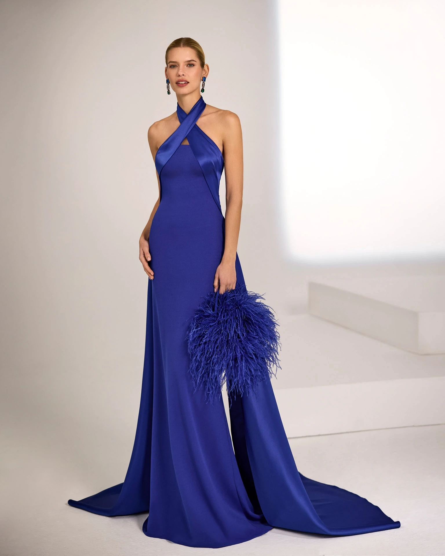 Un abito che cattura lo sguardo per la sua linea scultorea e raffinata. Realizzato in un elegante crepe blu royal, presenta una scollatura all’americana incrociata che valorizza spalle e décolleté con un design moderno e molto sofisticato. La silhouette è lunga e slanciata, morbida sui fianchi e più fluida sul fondo, mentre sul retro sorprende con un dettaglio scenografico: due pannelli in satin che creano uno strascico leggero, regalando movimento e un effetto couture ad ogni passo. Perfetto per chi cerca un look di grande impatto, contemporaneo e femminile.