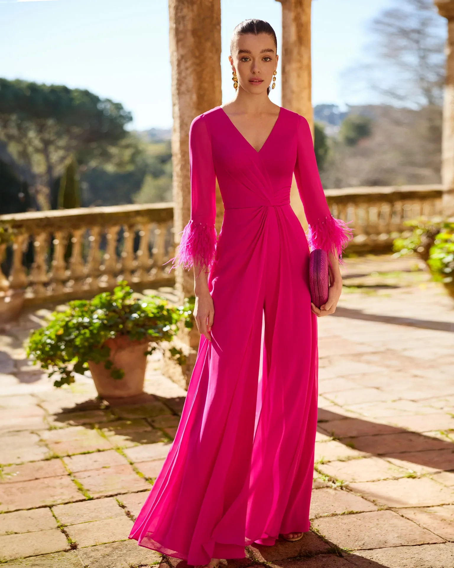 Una tuta da cerimonia dal fascino contemporaneo, pensata per chi desidera un look sofisticato senza rinunciare alla personalità. Realizzata in un fluido chiffon magenta, presenta una silhouette morbida con pantaloni ampi che slanciano la figura e accompagnano ogni movimento con leggerezza. Il corpino con scollo a V, drappeggio centrale e punto vita definito valorizza la linea del busto, mentre le maniche tre quarti arricchite da piume tono su tono aggiungono un dettaglio ricercato e scenografico, perfetto per eventi speciali.