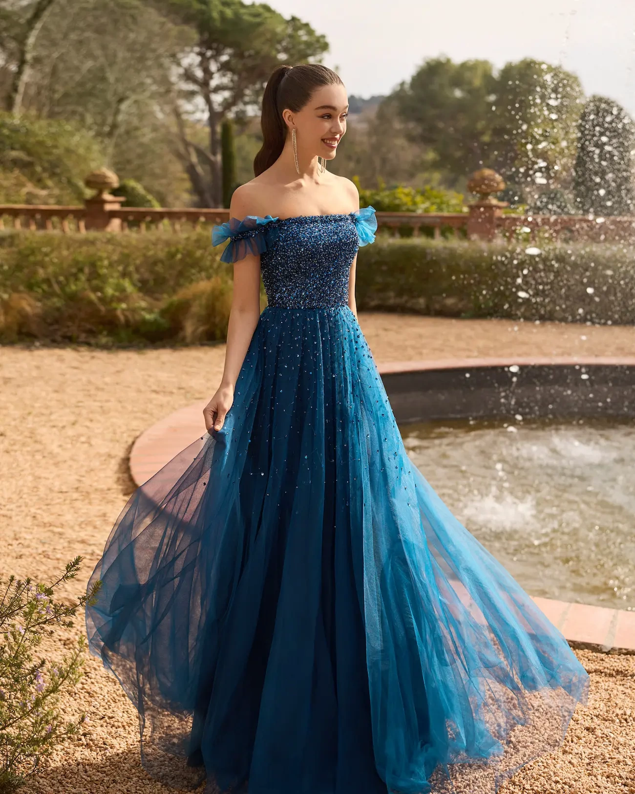 Il corpino interamente ricamato con luminose paillettes tono su tono esalta la linea femminile e dona un effetto prezioso e scintillante ad ogni movimento. Le delicate maniche off-shoulder in tulle leggero aggiungono un tocco romantico e sofisticato. La gonna, realizzata in tulle morbido, scende fluida creando un volume etereo e leggerissimo. I piccoli punti luce ricamati sulla gonna donano profondità e una luminosità diffusa dal effetto “polvere di stelle”. Un modello perfetto per chi desidera un look elegante, moderno e altamente scenografico!