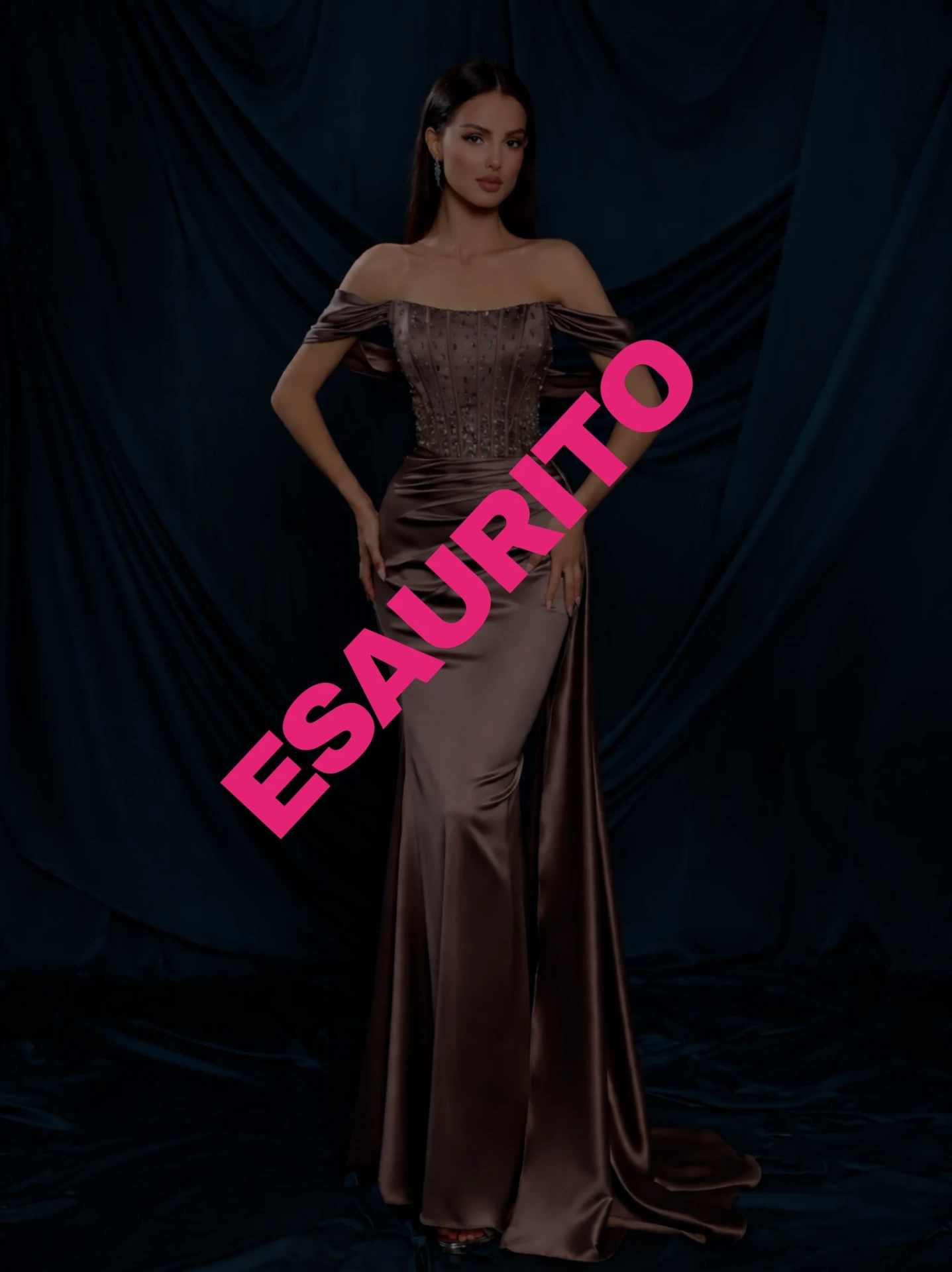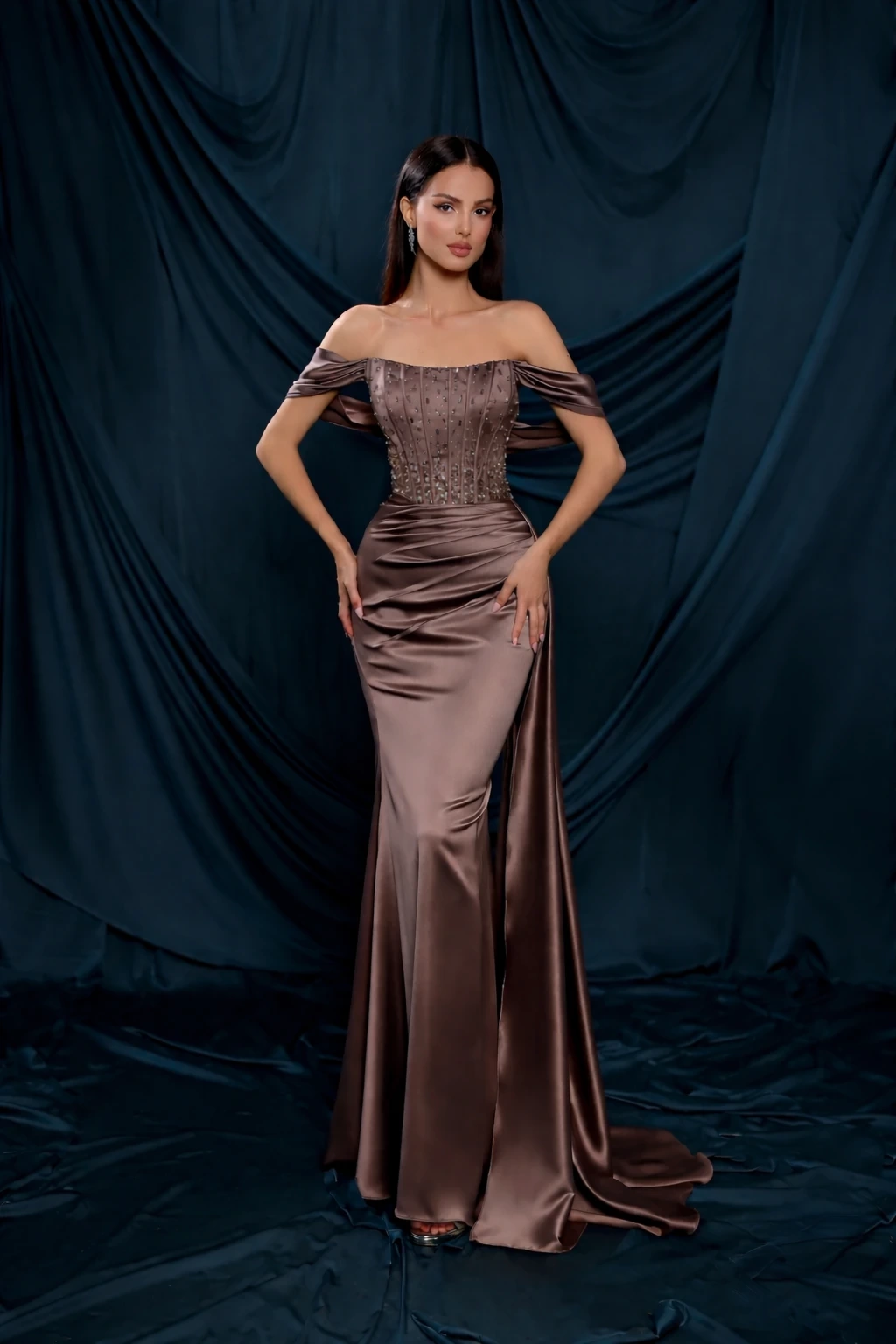 Abito da cerimonia lungo dal fascino sofisticato e sensuale, realizzato in luminoso raso dalla texture setosa che accarezza la silhouette. Il corpino strutturato, con effetto corsetto, è impreziosito da raffinati ricami e micro applicazioni luminose che valorizzano il busto e donano carattere all’intero look. Lo scollo bardot con spalline scivolate sulle braccia esalta le spalle e il décolleté con eleganza, mentre la gonna lunga e aderente accompagna le forme con naturalezza, aprendosi leggermente sul fondo e terminando in un morbido strascico per un effetto scenografico. Un abito pensato per chi desidera distinguersi con classe, ideale per cerimonie serali, eventi esclusivi e occasioni importanti in cui l’eleganza deve farsi notare senza eccessi.
