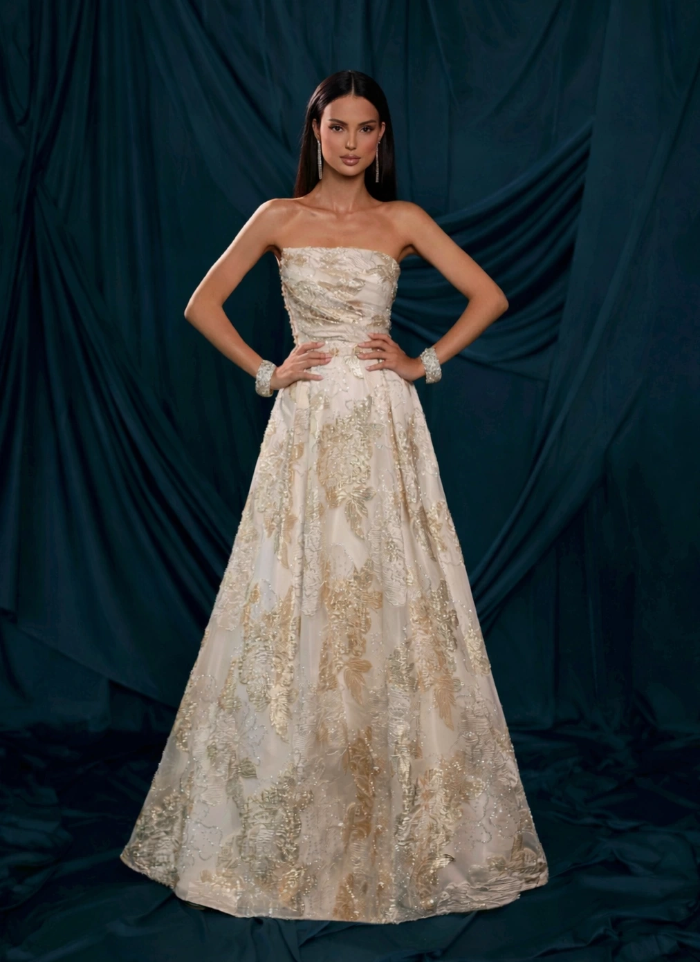 Un abito da sposa alternativo pensato per la donna che desidera distinguersi e vivere il proprio matrimonio con personalità, eleganza e carattere. Questo modello unisce una struttura raffinata a preziosi ricami floreali in tonalità oro e champagne che si intrecciano su una base avorio, creando un effetto luminoso e sofisticato. Il corpino drappeggiato valorizza il punto vita, mentre la gonna ampia e scenografica dona movimento e regalità ad ogni passo. Perfetto per una sposa non tradizionale che vuole uscire dagli schemi del classico bianco, senza rinunciare alla raffinatezza. Ideale per location eleganti, ville storiche o ricevimenti glamour.