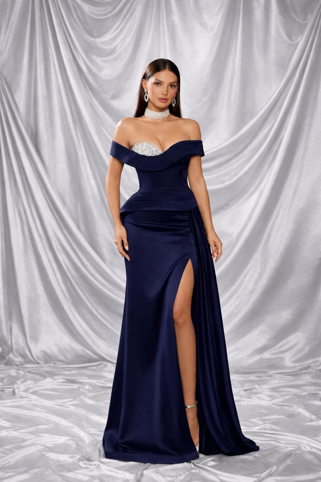 Abito da cerimonia lungo dall’eleganza intensa e contemporanea, pensato per valorizzare la silhouette con linee decise e dettagli luminosi. Il corpetto strutturato con scollo off-shoulder avvolge il décolleté in modo raffinato, mettendo in risalto il punto vita grazie a una lavorazione sartoriale che crea un effetto scultoreo.Il bustino è impreziosito da un inserto gioiello centrale che cattura la luce e dona un tocco prezioso all’insieme. La gonna, dalla linea aderente, scivola fluida fino a terra ed è completata da uno spacco frontale che slancia la figura e aggiunge femminilità e movimento al passo.Un abito sofisticato e di forte personalità, ideale per cerimonie serali, eventi esclusivi o per chi desidera distinguersi con uno stile elegante, moderno e di grande impatto.