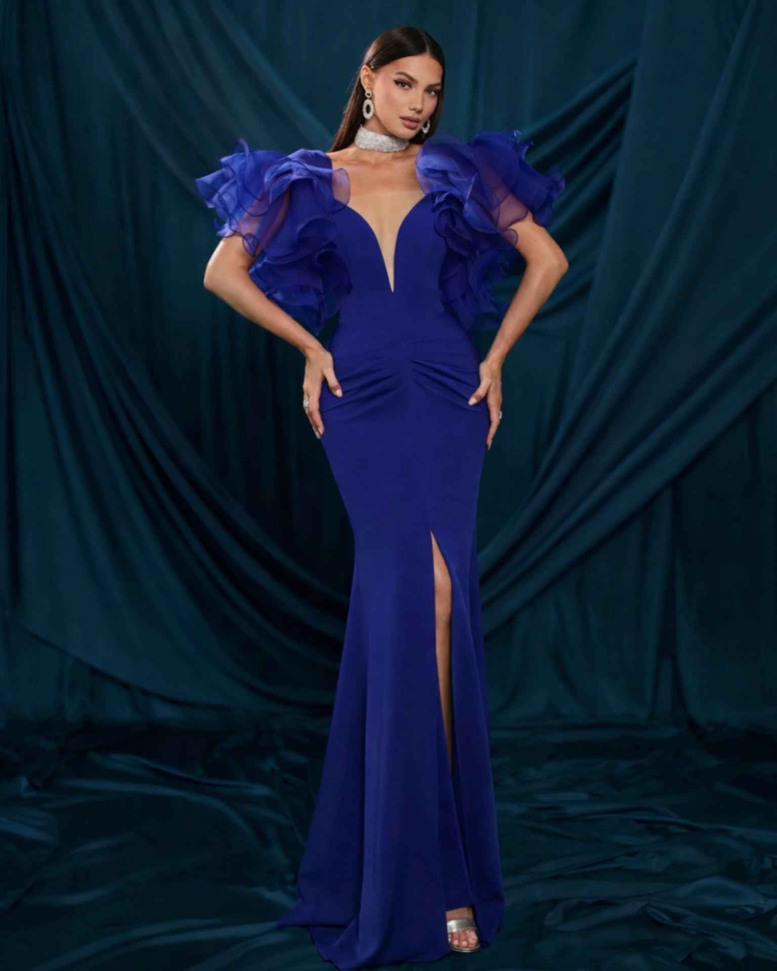 Abito da cerimonia lungo dal carattere scenografico e sofisticato, pensato per una donna che ama distinguersi con eleganza e personalità. La profonda tonalità di blu intenso esalta la linea sinuosa dell’abito, donando un’allure raffinata e senza tempo. Il corpetto presenta un sensuale scollo a V con inserto in tulle illusion, studiato per valorizzare il décolleté con equilibrio e classe. Le maniche corte in organza strutturata, leggere e voluminose, aggiungono un tocco couture e rendono il modello unico e scenografico. La gonna scivolata segue armoniosamente le forme, arricchita da delicati drappeggi sul punto vita che slanciano la figura. Lo spacco frontale dona movimento e femminilità, mantenendo sempre un’eleganza misurata.