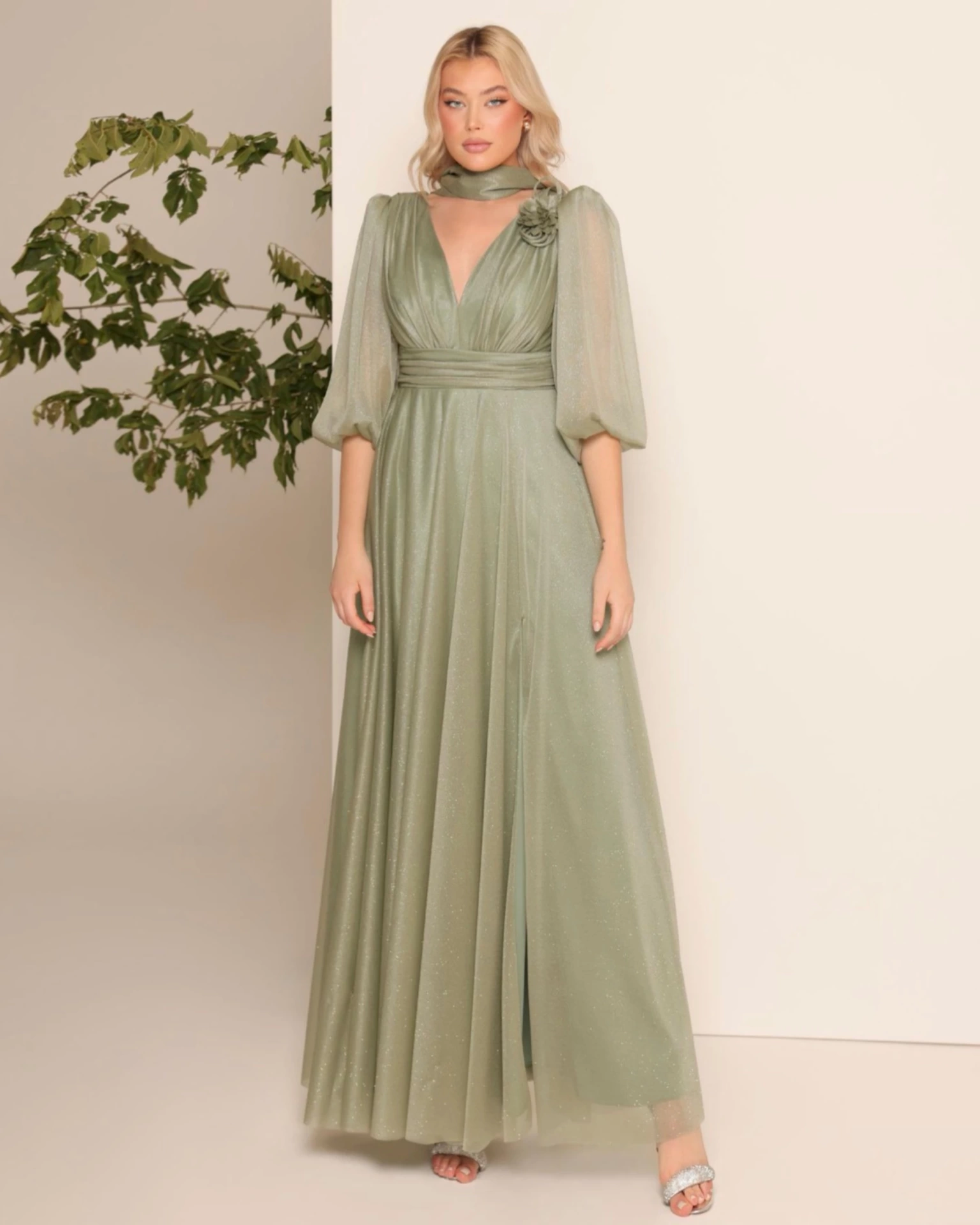 Un abito pensato per esaltare le forme con leggerezza ed equilibrio. Questo modello lungo da cerimonia è realizzato in tulle impalpabile leggermente luminoso, che dona movimento e un’eleganza delicata ad ogni passo. Il corpino con scollo a V valorizza il décolleté con naturalezza, mentre la fascia alta in vita definisce la silhouette accompagnando le forme senza costringere. Le maniche morbide a tre quarti, leggermente trasparenti, donano comfort e copertura con un effetto estremamente femminile. Il dettaglio floreale tono su tono sul corpino aggiunge un tocco romantico e raffinato, mentre la gonna fluida scende morbida slanciando la figura.