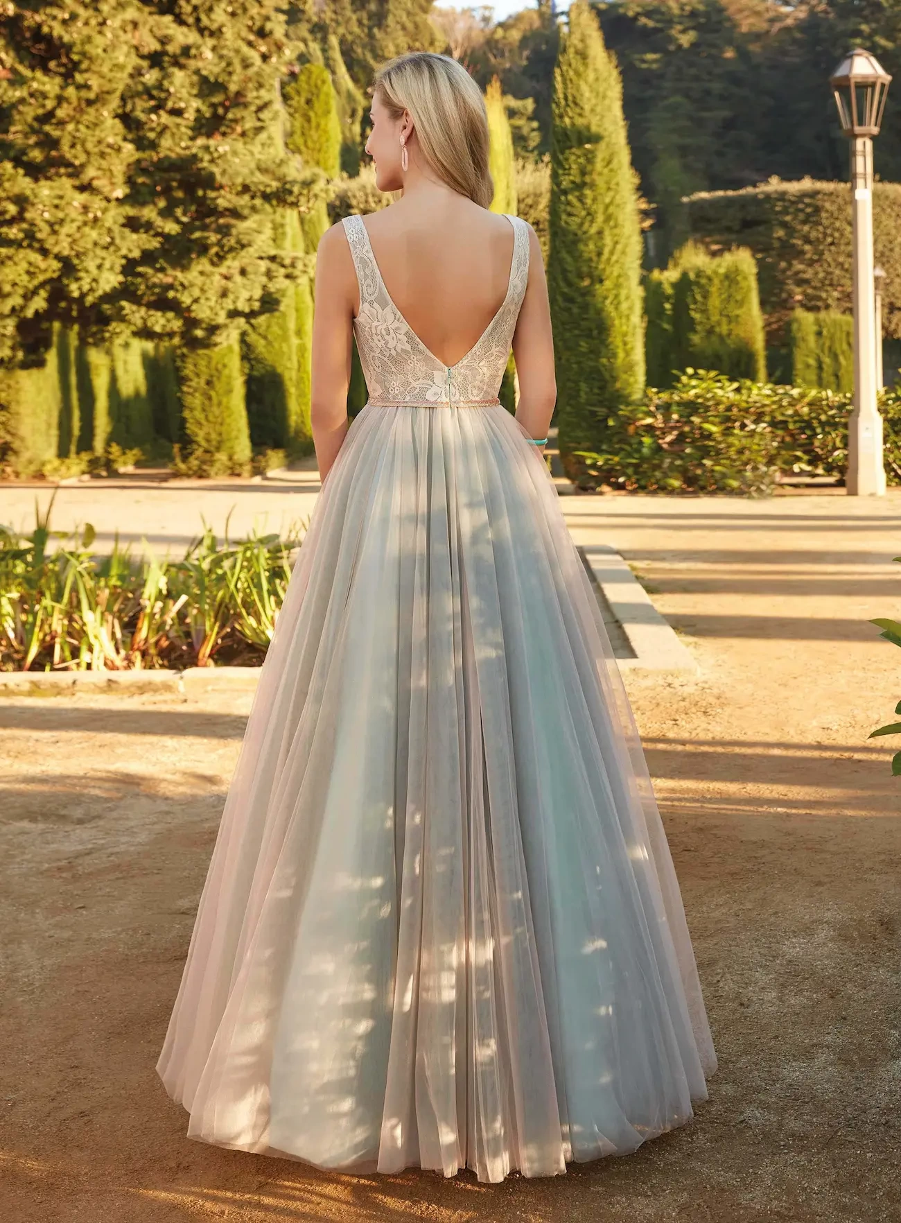 Un bellissimo abito con leggero scollo a V davanti e sulla schiena. Il corpino leggermente drappeggiato è impreziosito da diverse tipologie di pizzo con paillettes. Il cinturino sottolinea il punto vita lasciando spazio ad una gonna in tulle bicolore che dona leggerezza all’abito. Disponibile in Atelier nella variante colore della foto.