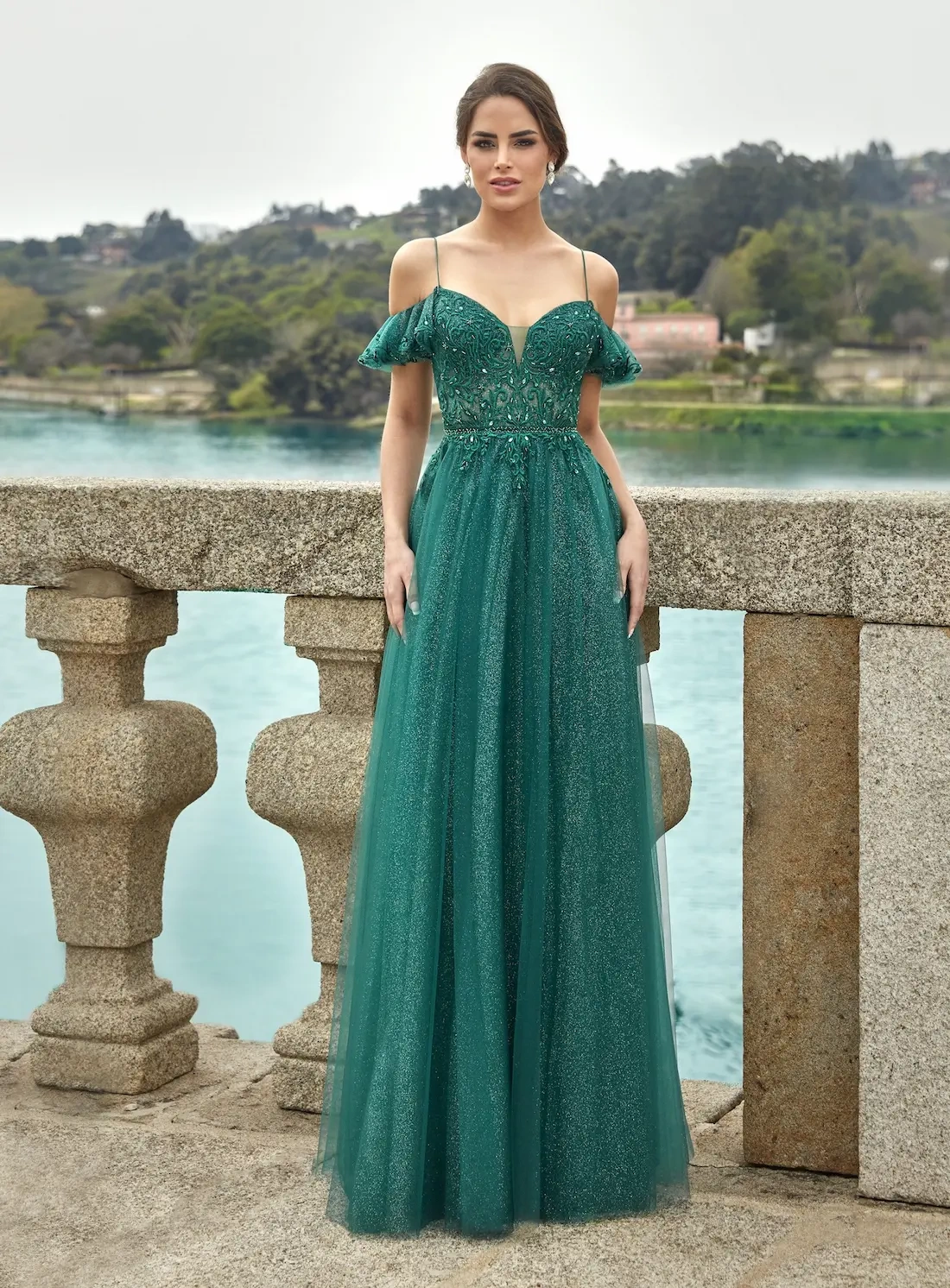 Una abito da cerimonia con un bustino in pizzo ornato di preziosi cristalli che cattura lo sguardo e sottolinea la silhouette con delicatezza. Le spalline omerali sono il tocco finale che conferiscono una nota di sofisticatezza. La gonna in tulle glitterato, con la sua luminosità e movimento, crea un effetto di meravigliosa maestosità, trasformando questo abito in un'opera d'arte. Disponibile in Atelier nella variante colore della foto e malva.