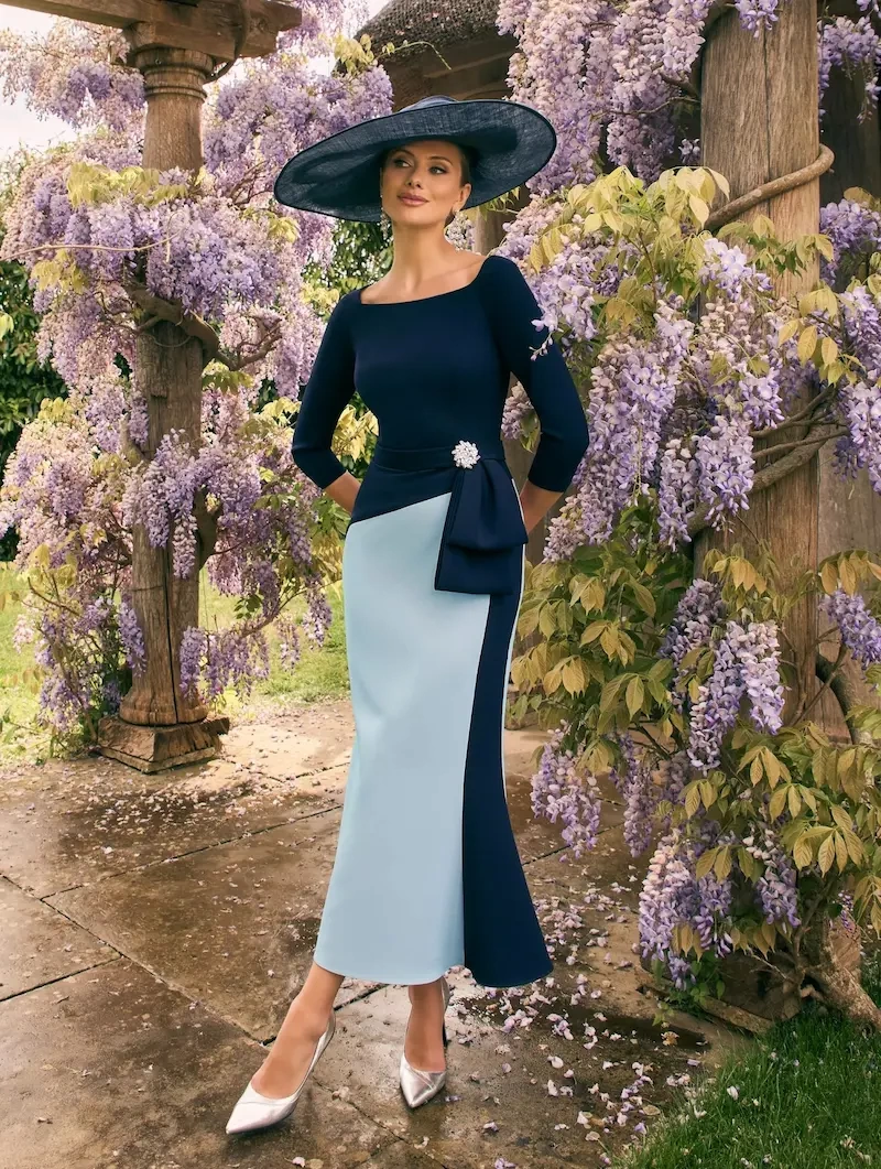 Abito da cerimonia raffinato ed estremamente femminile, caratterizzato da linee pulite e da un gioco cromatico navy–paleblue che slancia la figura con gusto e armonia. Il corpino presenta scollo a barchetta e manica a 3/4, ideale per chi desidera un’eleganza discreta ma sempre d’impatto.