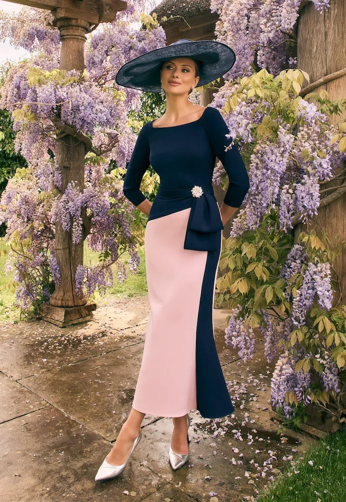 Abito da cerimonia raffinato ed estremamente femminile, caratterizzato da linee pulite e da un gioco cromatico navy–blush che slancia la figura con gusto e armonia. Il corpino presenta scollo a barchetta e manica a 3/4, ideale per chi desidera un’eleganza discreta ma sempre d’impatto.