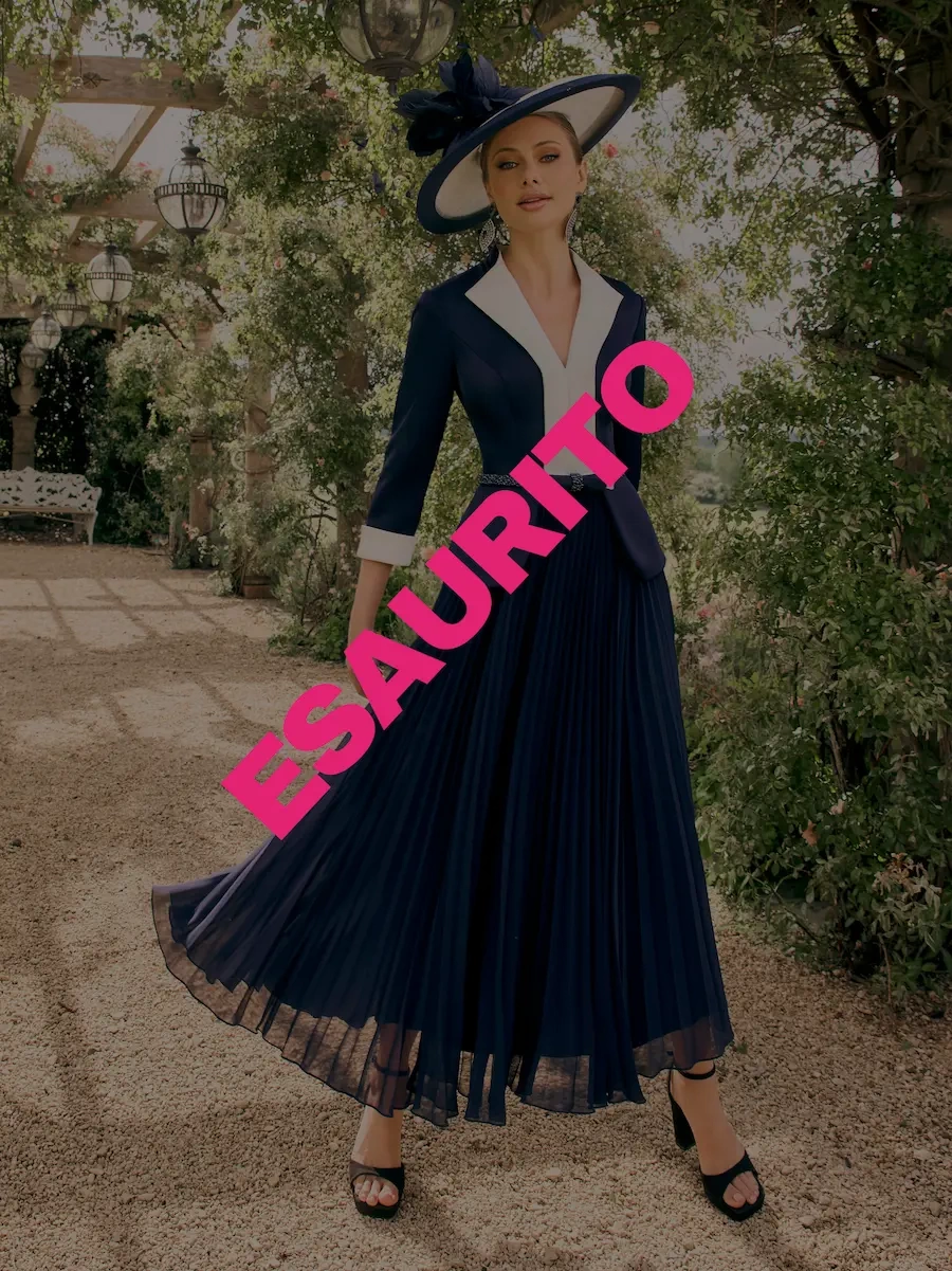 Questo abito da cerimonia è un inno all’eleganza senza tempo, pensato per una donna che ama distinguersi con classe e personalità. La giacca strutturata in blu navy profondo, impreziosita da rever a contrasto color avorio, crea un raffinato gioco grafico che valorizza il décolleté e slancia la figura. Le maniche a tre quarti con polsino chiaro aggiungono un tocco sartoriale ricercato, mentre la cintura gioiello sottolinea delicatamente il punto vita. La gonna plissé, fluida e leggera, accompagna ogni movimento con grazia, donando all’insieme un’eleganza dinamica e femminile.