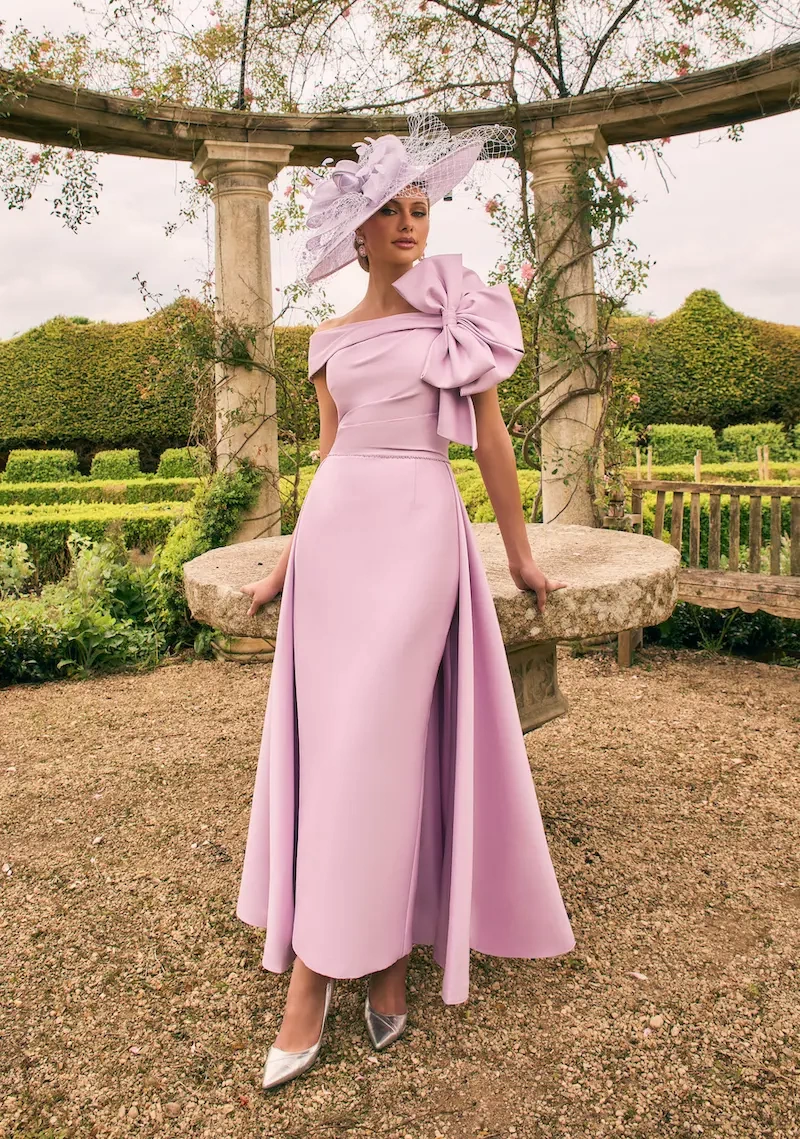 La linea scivolata valorizza la silhouette con naturalezza, mentre lo scollo off-shoulder dona un’eleganza delicata e femminile. Il protagonista è il maxi fiocco scultoreo sulla spalla, un dettaglio couture che aggiunge carattere e rende l’abito immediatamente iconico. La gonna midi, fluida e leggermente svasata, accompagna il movimento con leggerezza, creando un equilibrio perfetto tra struttura e morbidezza. La tonalità lilla, luminosa e sofisticata, è ideale per cerimonie diurne, matrimoni all’aperto, contesti romantici e giardini storici.