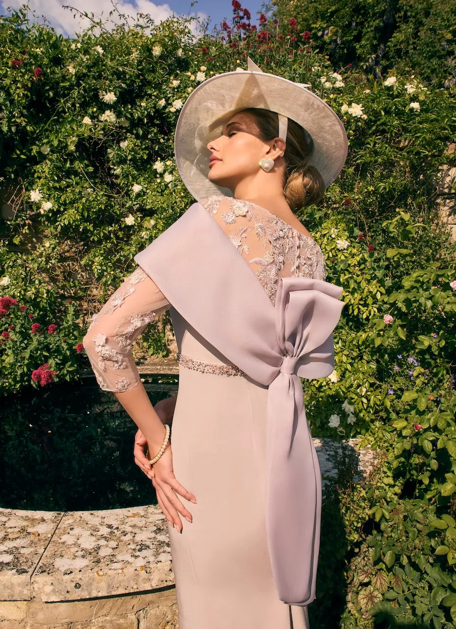 La linea longuette, pulita e slanciata, avvolge la figura con naturalezza, valorizzando la silhouette grazie al taglio sartoriale impeccabile. Il corpino è impreziosito da un raffinato scollo bateau con mantellina strutturata, che incornicia delicatamente le spalle e dona un’eleganza regale. Le maniche in pizzo ricamato trasparente, leggere e luminose, aggiungono un tocco romantico e sofisticato, perfetto per cerimonie importanti.Il punto vita è definito da una cintura gioiello, che illumina l’abito con discrezione, mentre sul retro un importante fiocco scenografico diventa il dettaglio protagonista, regalando movimento e personalità all’intero look. La tonalità taupe rende questo abito estremamente raffinato e versatile, ideale per cerimonie diurne o pomeridiane, giardini storici, ville e contesti esclusivi.