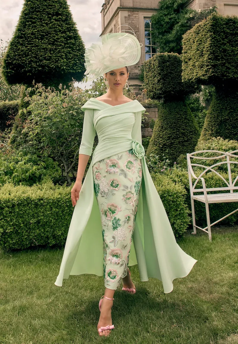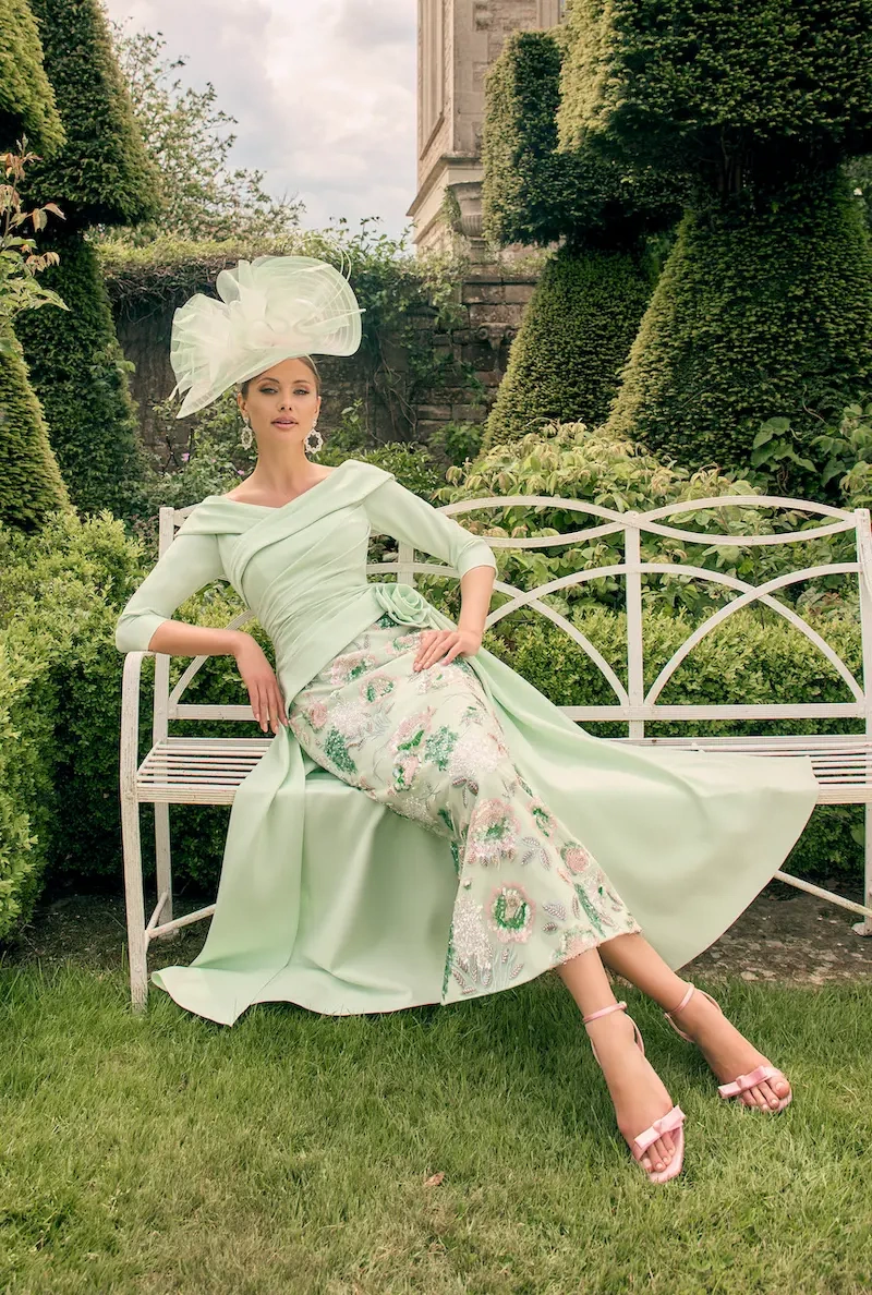 Questo modello conquista con la sua delicata tonalità verde salvia/seafoam, fresca e sofisticata, ideale per cerimonie diurne ed eventi immersi nella natura. Il corpino drappeggiato avvolge la silhouette con morbidezza, creando un elegante scollo che valorizza le spalle, mentre la manica a tre quarti dona equilibrio e raffinatezza. La gonna, impreziosita da ricami floreali luminosi, aggiunge un tocco romantico e prezioso, creando un contrasto raffinato con la sovragonna fluida che accompagna ogni movimento con leggerezza. Il fiore applicato in vita enfatizza il punto vita e completa il look con un dettaglio sartoriale ricercato.Un abito pensato per una donna che desidera distinguersi con classe, perfetto per mamma della sposa o dello sposo, ma anche per invitate che cercano un’eleganza ricercata, mai eccessiva.Un equilibrio perfetto tra romanticismo, freschezza e stile couture.