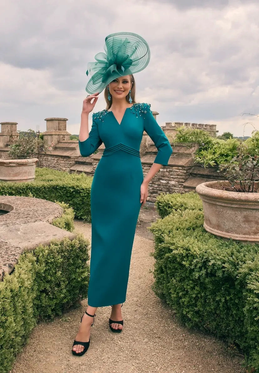 Abito lungo dalla linea slim e sofisticata, realizzato in tessuto strutturato che valorizza la silhouette con eleganza e precisione. Il corpetto con scollo a V slancia il décolleté mantenendo uno stile raffinato, mentre il punto vita definito da delicate impunture crea un effetto snellente e armonioso. Le maniche a tre quarti donano equilibrio e rendono l’abito perfetto anche per cerimonie più formali, mentre le applicazioni gioiello sulle spalle aggiungono luce e carattere, impreziosendo il design con discreta raffinatezza. La gonna dritta e fluida accompagna il movimento senza segnare, garantendo comfort e portamento impeccabile. Un modello ideale per mamma della sposa o dello sposo, per invitate che desiderano un look elegante e deciso, o per eventi esclusivi dove la sobrietà incontra il dettaglio ricercato.