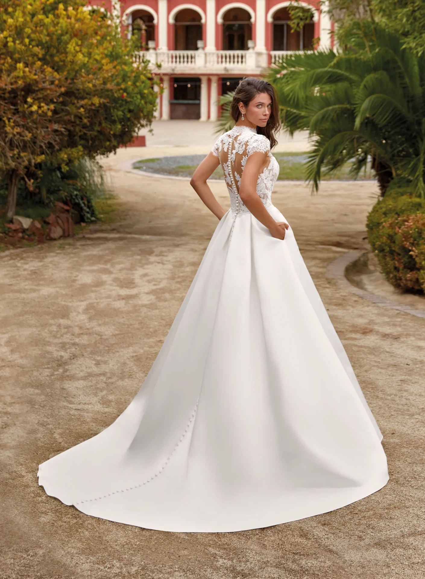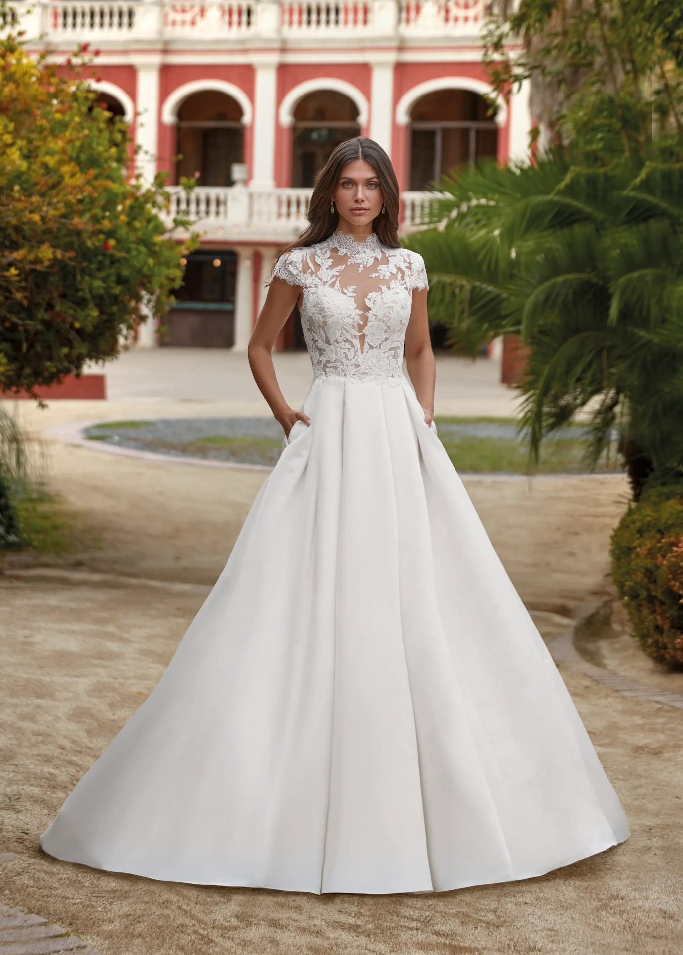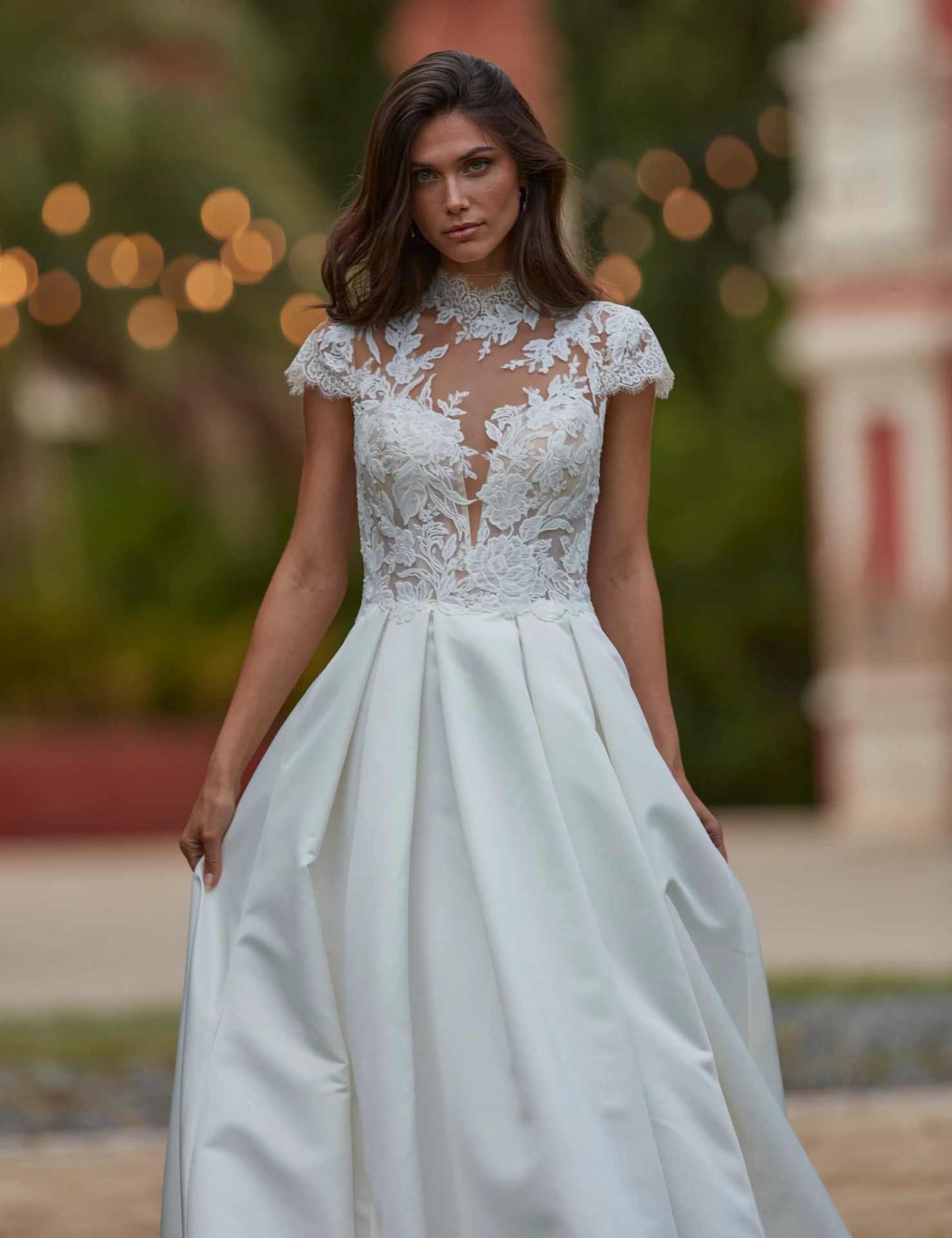 Il modello 25014 della Nuova Collezione firmata Amelie unisce classe e raffinatezza con un tocco moderno. Il corpetto, interamente ricamato con motivi floreali, si distingue per il raffinato effetto illusion che gioca con trasparenze e pizzo, valorizzato da un delicato collo altro e maniche corte che esaltano la femminilità con discrezione. La gonna in satin dalla linea ampia a cannoni crea una silhouette sontuosa, con tasche laterali invisibili che aggiungono un dettaglio contemporaneo e funzionale. Sul retro la schiena semi scoperta in pizzo si chiude con un elegante motivo di bottoncini rivestiti. Perfetto per la sposa che ama lo stile classico ma vuole distinguersi con un tocco couture, grazie al pizzo effetto tattoo, al collo alto e alla struttura importante della gonna!