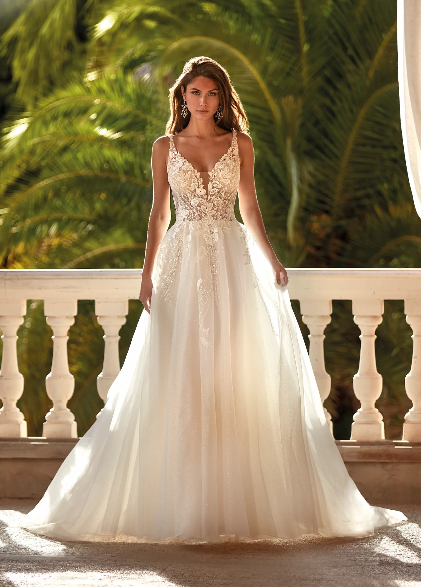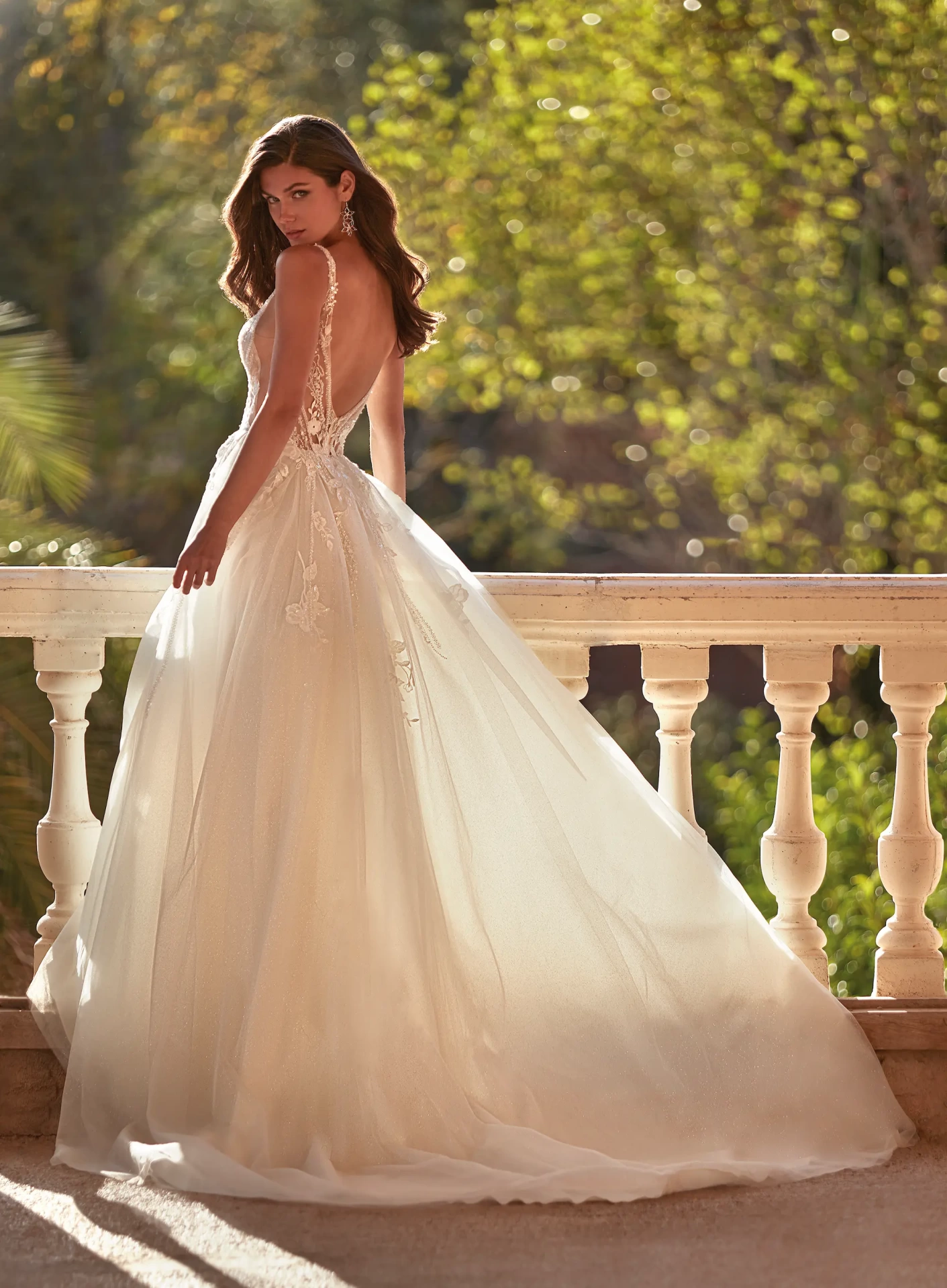 Il modello 25015 della Nuova Collezione Sposa firmata Amelie è un incanto di luce e delicatezza. Il corpino a effetto tattoo, ricamato con perline e cristalli, abbraccia il busto con eleganza grazie allo scollo a V sia davanti che dietro. La gonna in tulle leggero si apre in una silhouette ampia e romantica, illuminata da punti luce raffinati che catturano ogni raggio di sole! Perfetto per la sposa che sogna un look femminile, etereo e naturale, questo modello si adatta splendidamente a cerimonie all'aperto: un matrimonio in una villa, in un giardino mediterraneo o in una location tra palme e cielo azzurro. Un abito pensato per chi vuole brillare con grazia, senza rinunciare alla leggerezza!