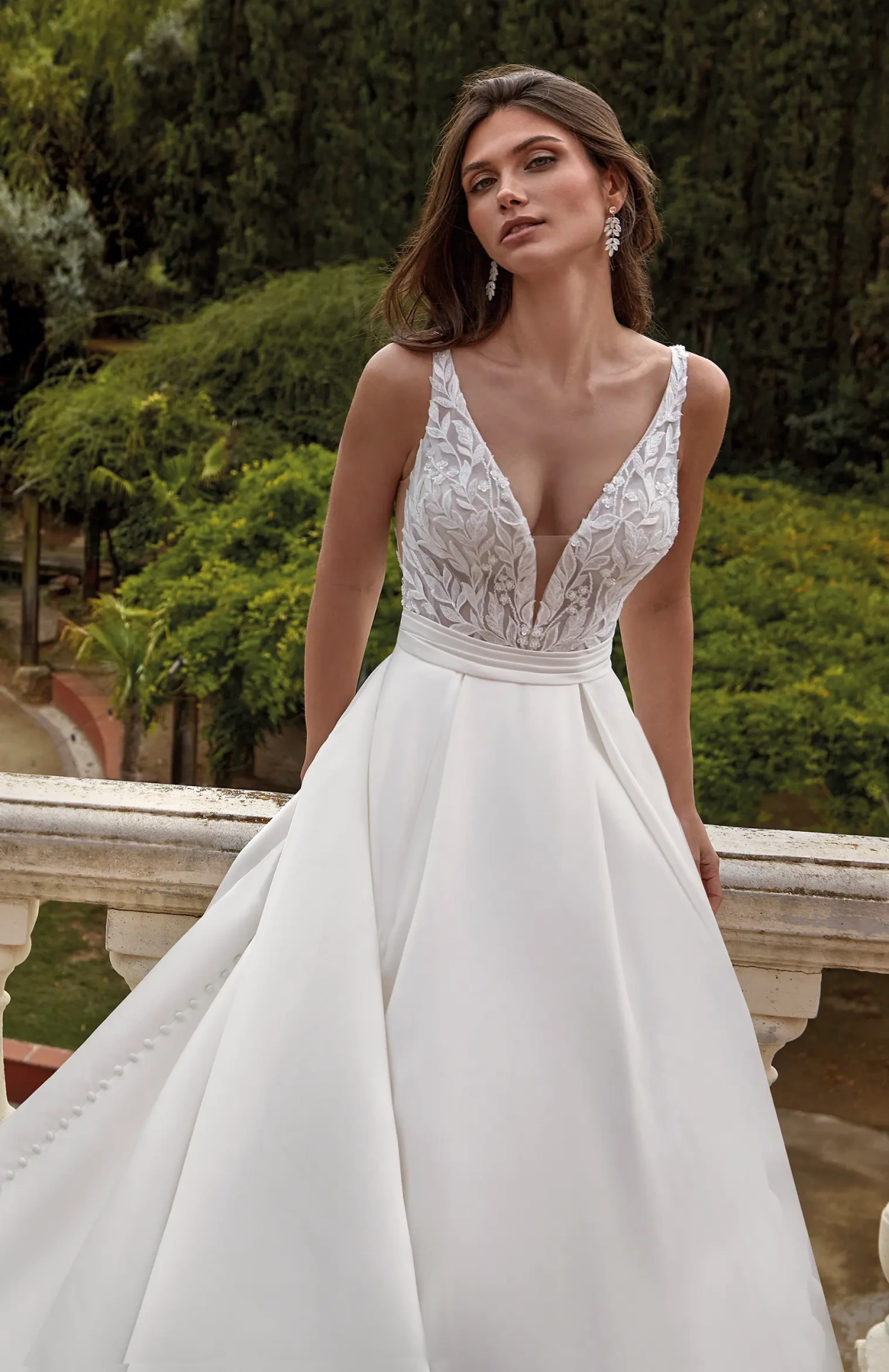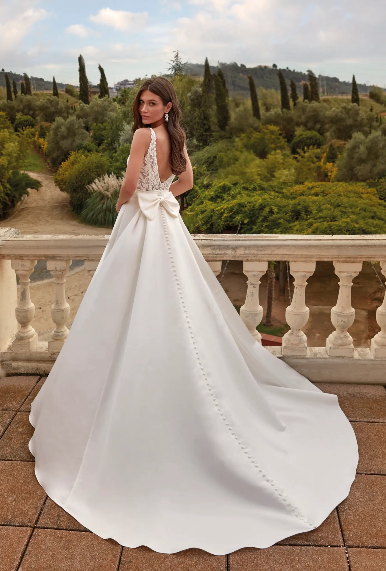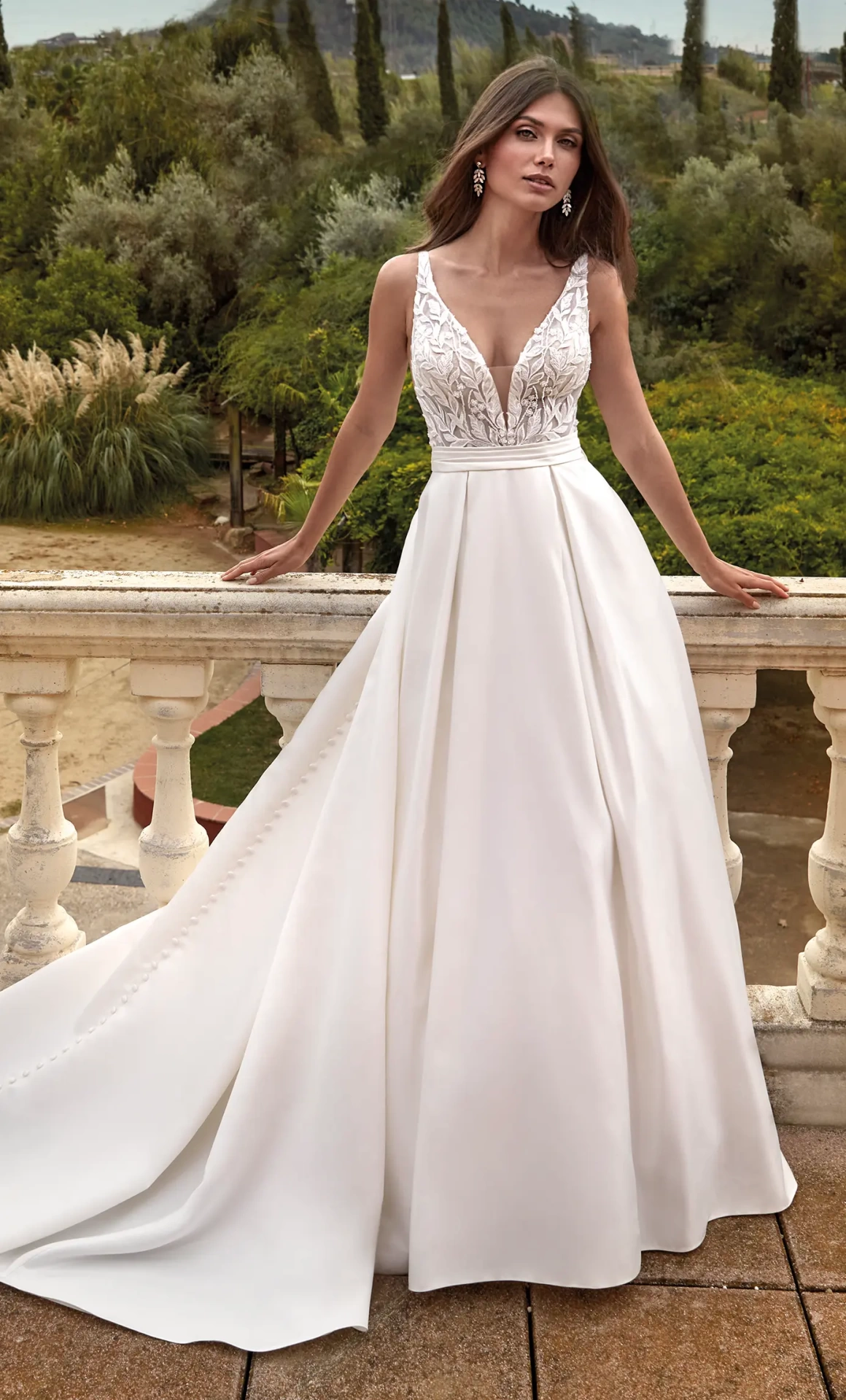 Il modello 25026 della Nuova Collezione Sposa firmata Amelie unisce il fascino senza tempo di una gonna in satin alla modernità del corpino ricamato con scollo a V profondo. I ricami dal gusto botanico donano al decolletè luce e struttura, mentre la profonda scollatura sulla schiena è impreziosita da un delicato inserto in pizzo. Sul retro la fila di bottoncini rivestiti e il fiocco in vita aggiungono un tocco couture che non passa inosservato! Ideale per la sposa che cerca un abito dai dettagli ricercati e ideale in giardini fioriti, wedding in serre botaniche e cerimonie civili immerse nel verde!