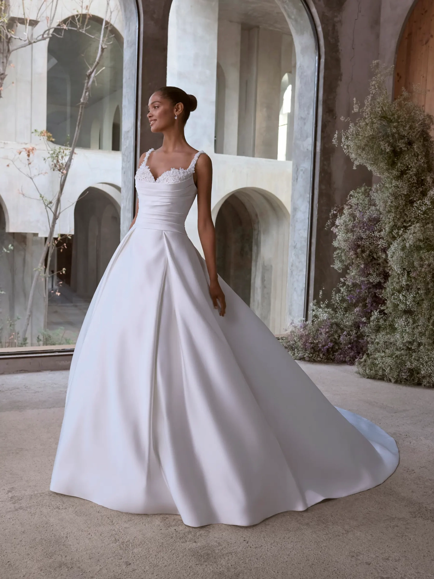 Il modello 2917 della Nuova Collezione Sposa firmata Morilee New York è pura raffinatezza: un bustino strutturato con ricami floreali trdimensionali e microperle esaltano il decollettè con grazia. La vita drappeggiata scolpisce la silhouette, mentre la gonna in satin scivola ampia e maestosa, con pieghe sartoriali che donano volume e movimento. Perfetto per una sposa sofisticata e femminile, che desidera un look elegante ma dal gusto moderno. Splendido in una location architettonica, una villa d'epoca o un giardino in fiore!