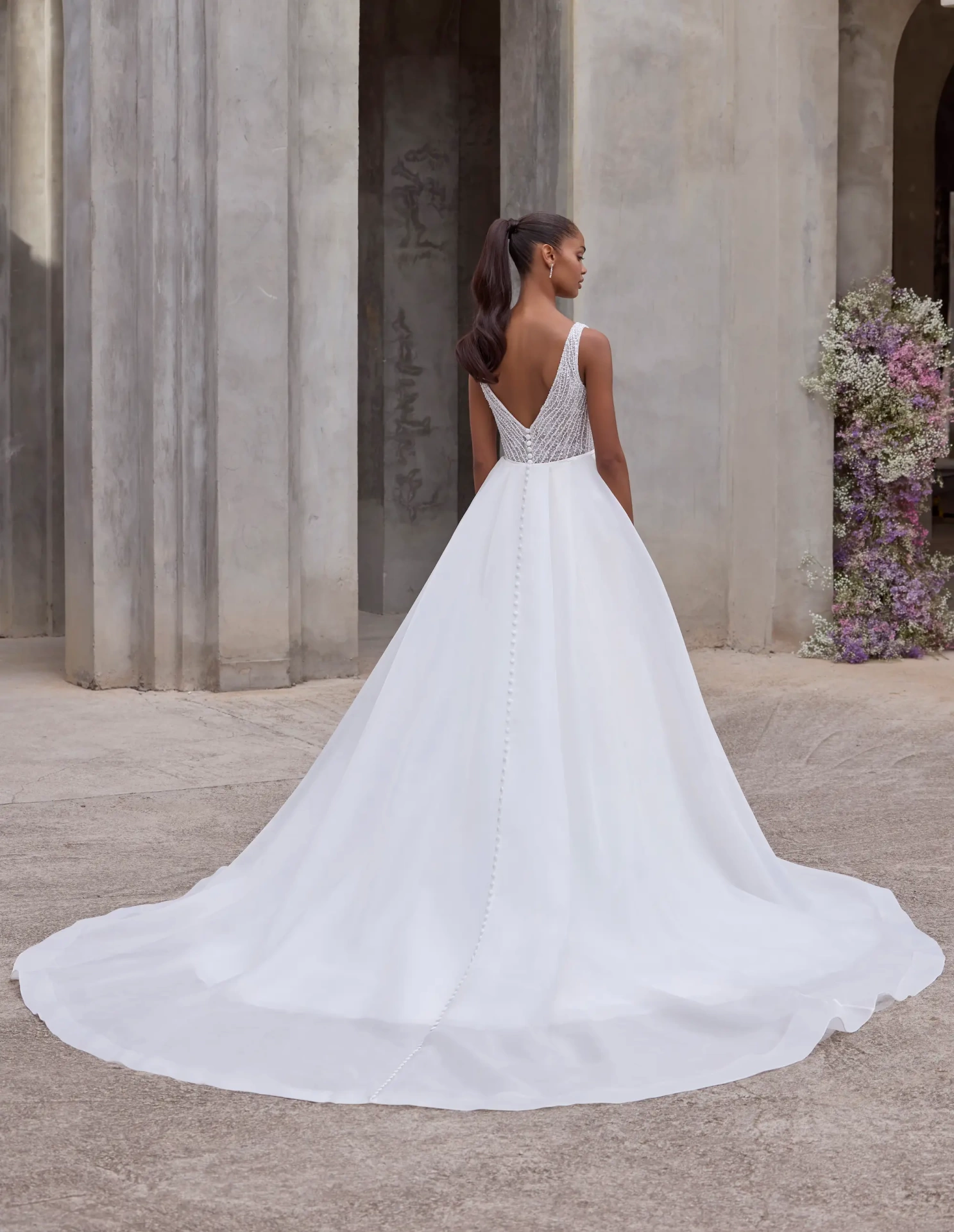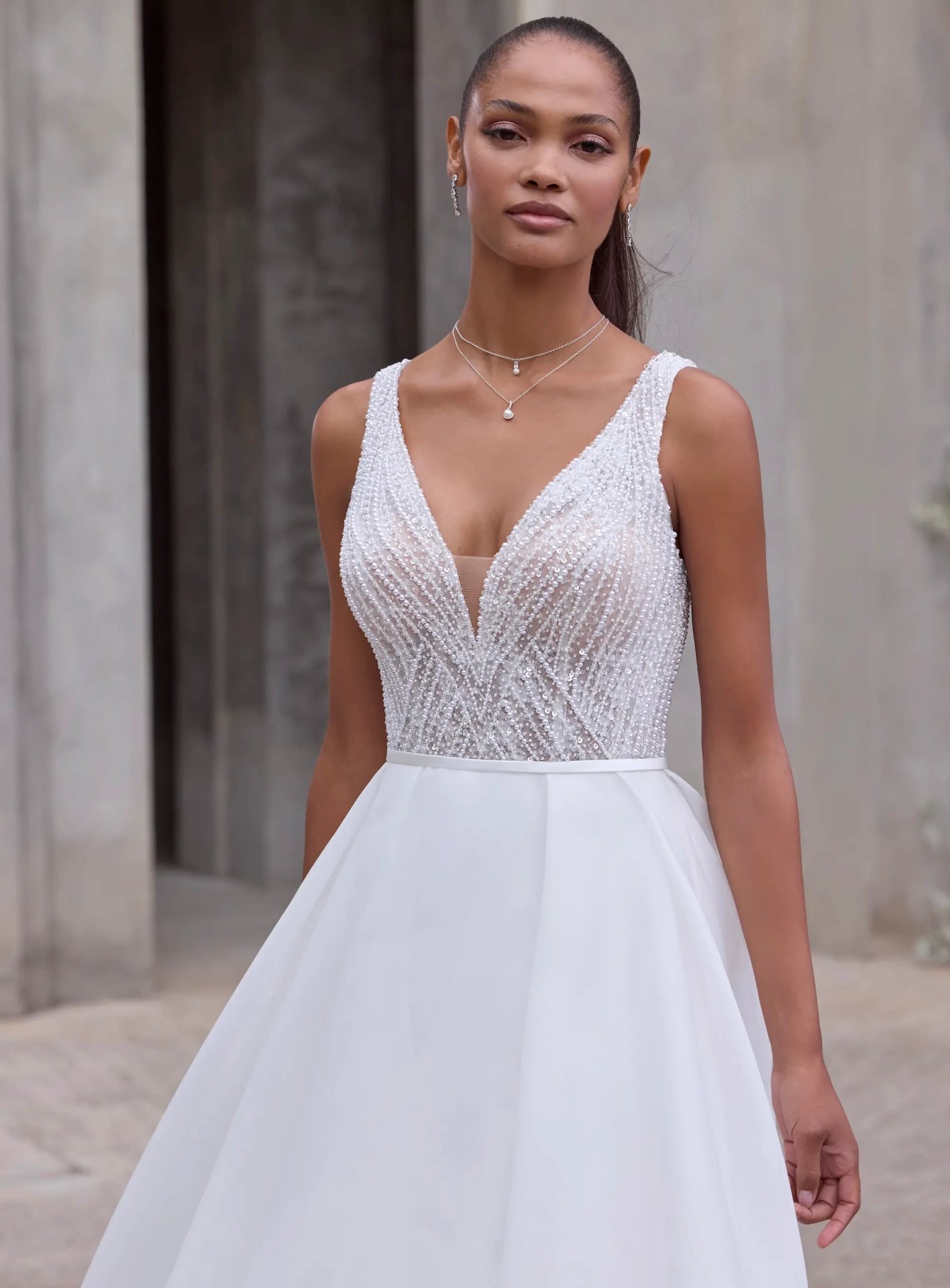 Il modello 2928 della Nuova Collezione Sposa firmata Morilee NewYork è la perfetta espressione di una femminilità decisa ma delicata: il corpetto interamente ricamato a mano con perle e microcristalli scolpisce il busto con linee preziose che accarezzano la silhouette, mentre la profonda scollatura a V dona sensualità. Il punto vita si apre su una gonna in organza morbidissima, che ondeggia leggera a ogni passo, con una coda eterea e bottoncini rivestiti che scorrono lungo la schiena come un tocco couture. Un modello pensato per la sposa che ama lo stile moderno, pulito, ma vuole brillare con classe in ogni dettaglio.