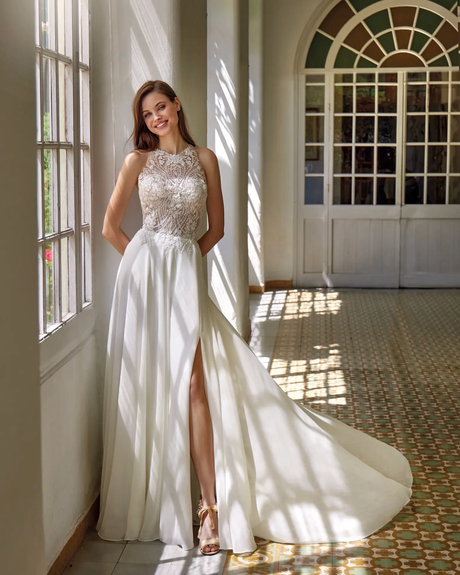 L’abito da sposa 40067, della Nuova Collezione Sposa firmata Amelie, è un connubio perfetto tra sensualità e raffinatezza. Il corpino effetto tattoo con scollo all’americana è interamente ricamato con perline e pizzo floreale, disegnando delicati motivi sulla pelle come un gioiello prezioso.La gonna morbida in chiffon con spacco frontale dona movimento, freschezza e un tocco di audace femminilità, senza mai rinunciare all’eleganza. Un modello leggero, romantico e perfetto per ballare fino all’alba.Ideale per la sposa moderna e radiosa, che ama la bellezza dei dettagli e sogna un matrimonio all’aperto, tra giardini mediterranei, terrazze vista mare o ville inondate di luce.