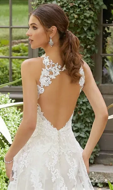 Un abito per la sposa che si vuole sentire romantica. Questo abito da sposa Mori Lee presenta un corpino con pizzo chantilly, scollo a cuore e carré trasparente con applicazioni di pizzo macramè. Il pizzo crea un’apertura che lascia visibile la schiena. La gonna data da più strati di pizzo dona un magnifico gioco di illusioni con una gala sull’orlo dell’abito.
