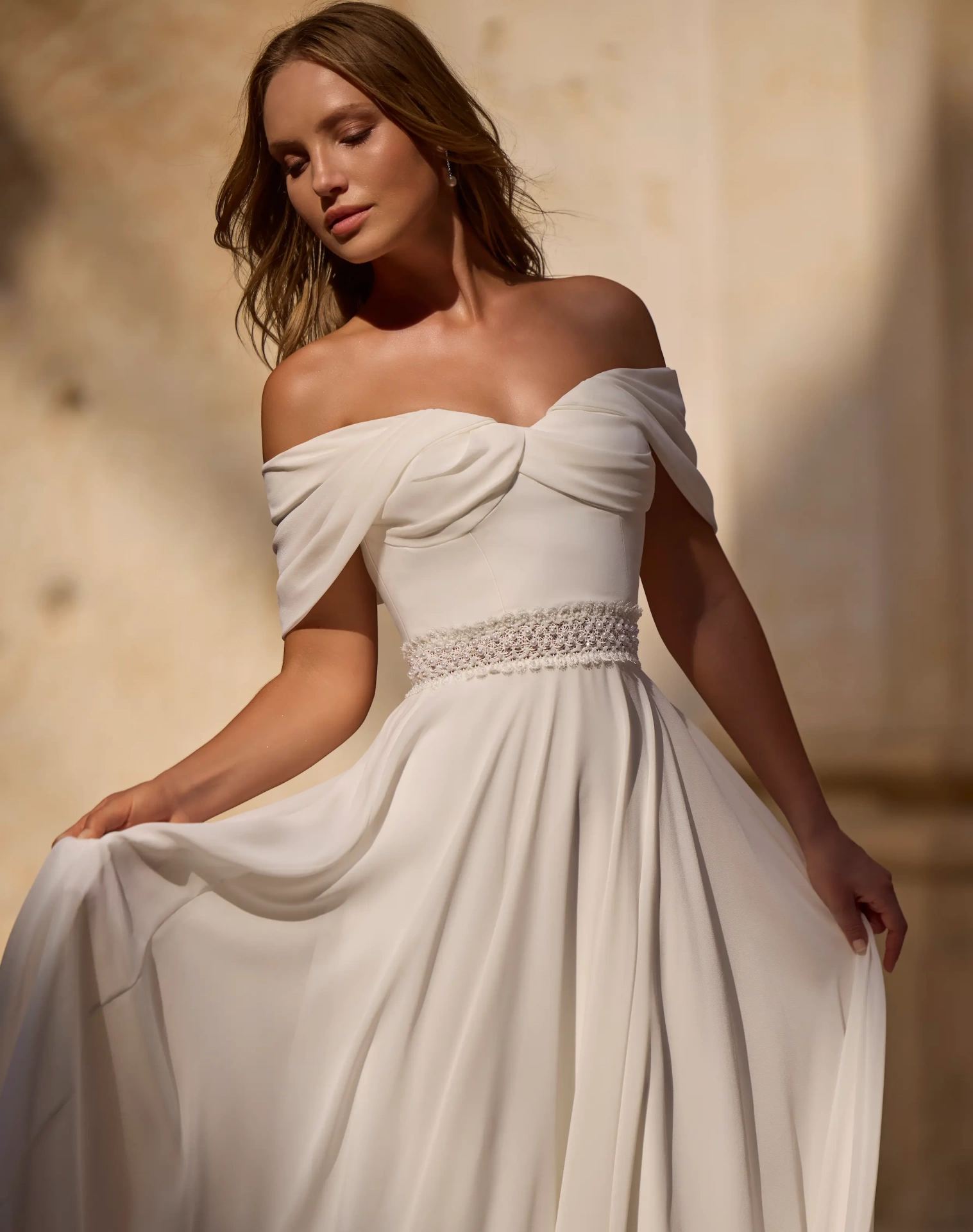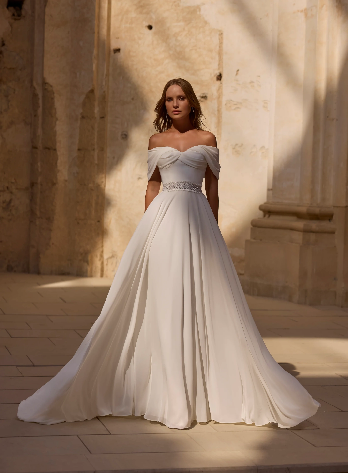 Il modello 63046 della Nuova Collezione Sposa firmata Veni Infantino conquista con la sua eleganza senza tempo e un fascino etereo che sembra danzare ad ogni passo. Il corpino drappeggiato scivola morbidamente sulle spalle, lasciandole scoperte in un gioco di sensualità delicata, mentre la cintura gioiello sottolinea con grazia il punto vita. La gonna ampia e fluida in chiffon leggero dona movimento e romanticismo, perfetta per una sposa che sogna un look raffinato ma non rigido, avvolto da un’allure quasi cinematografica. Ideale per matrimoni all’aperto o scenari mediterranei inondati di luce e bellezza. Una creazione pensata per chi ama la semplicità sofisticata e vuole sentirsi protagonista con naturalezza e stile.