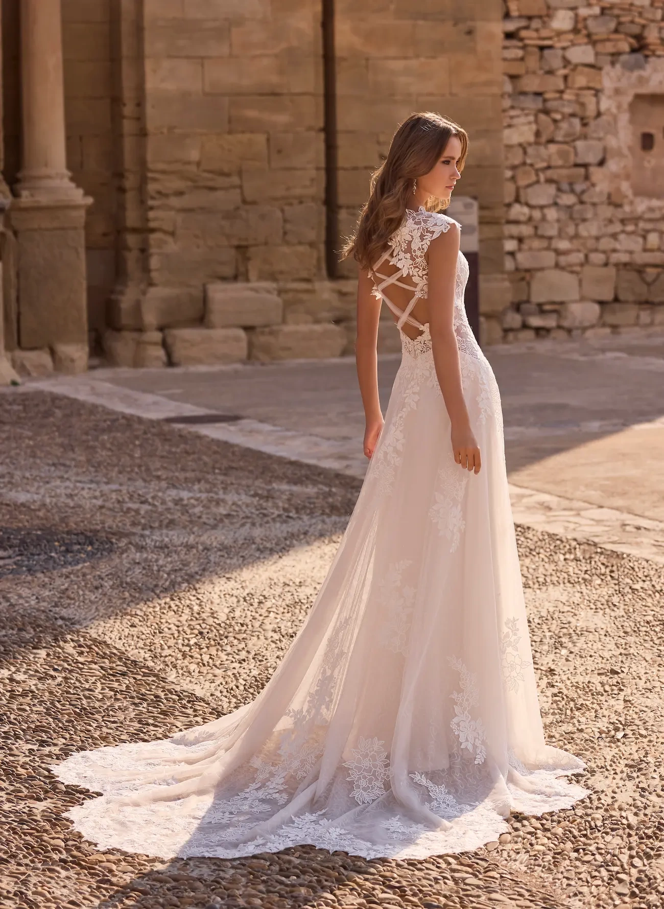 Il modello 63047, della Nuova Collezione Sposa firmata Veni Infantino, è un abito dal fascino romantico e delicato, perfetto per la sposa che desidera leggerezza e femminilità. Il corpetto in pizzo ricamato floreale, con scollo a V e leggere maniche ad aletta, scolpisce la figura con eleganza e naturalezza. Il retro sorprende con un intreccio di nastri che lascia la schiena scoperta, creando un gioco di trasparenze raffinato e moderno. La gonna in tulle scivola morbida sul corpo, illuminata da ricami che si rincorrono fino allo strascico. Un equilibrio perfetto tra dolcezza e sensualità.