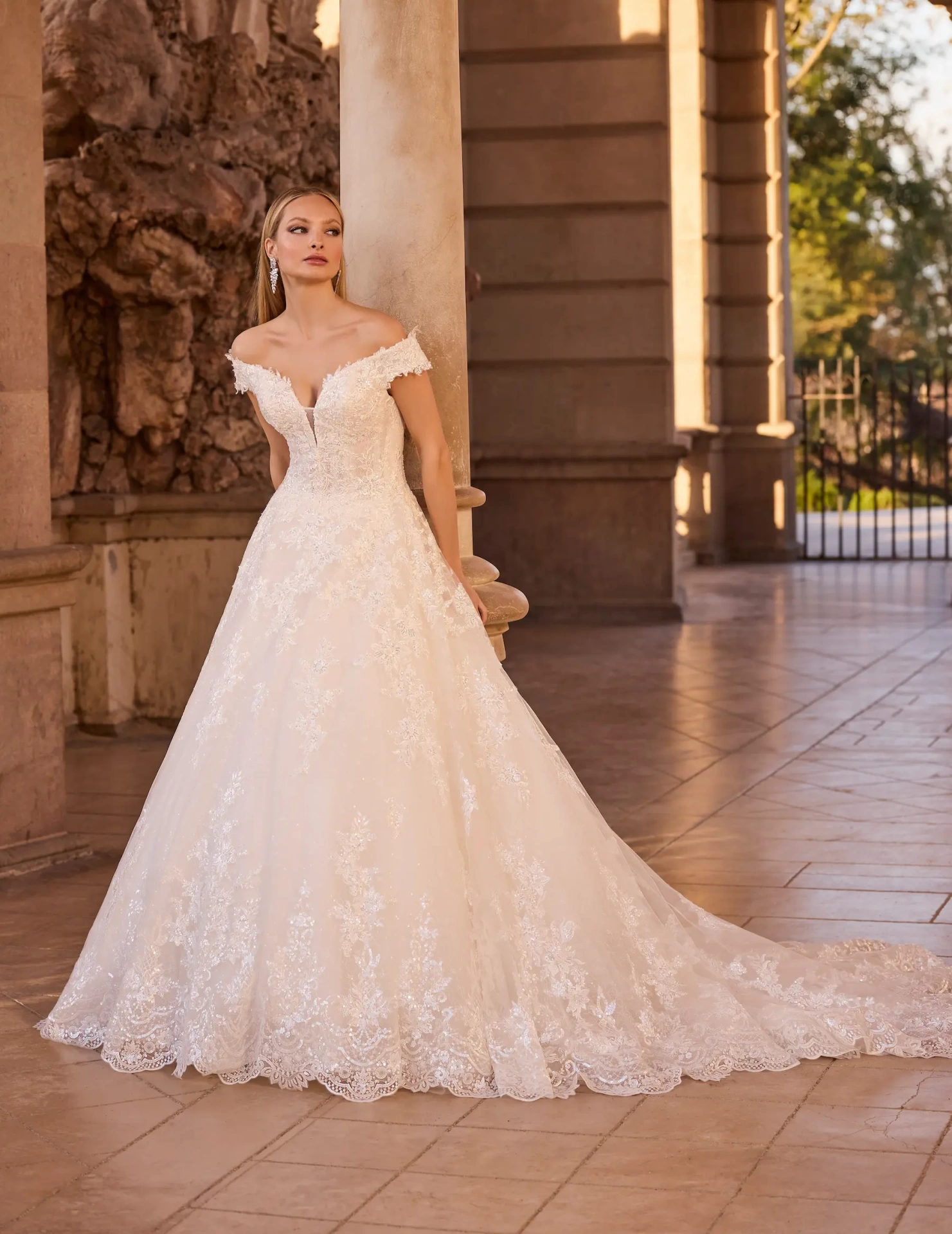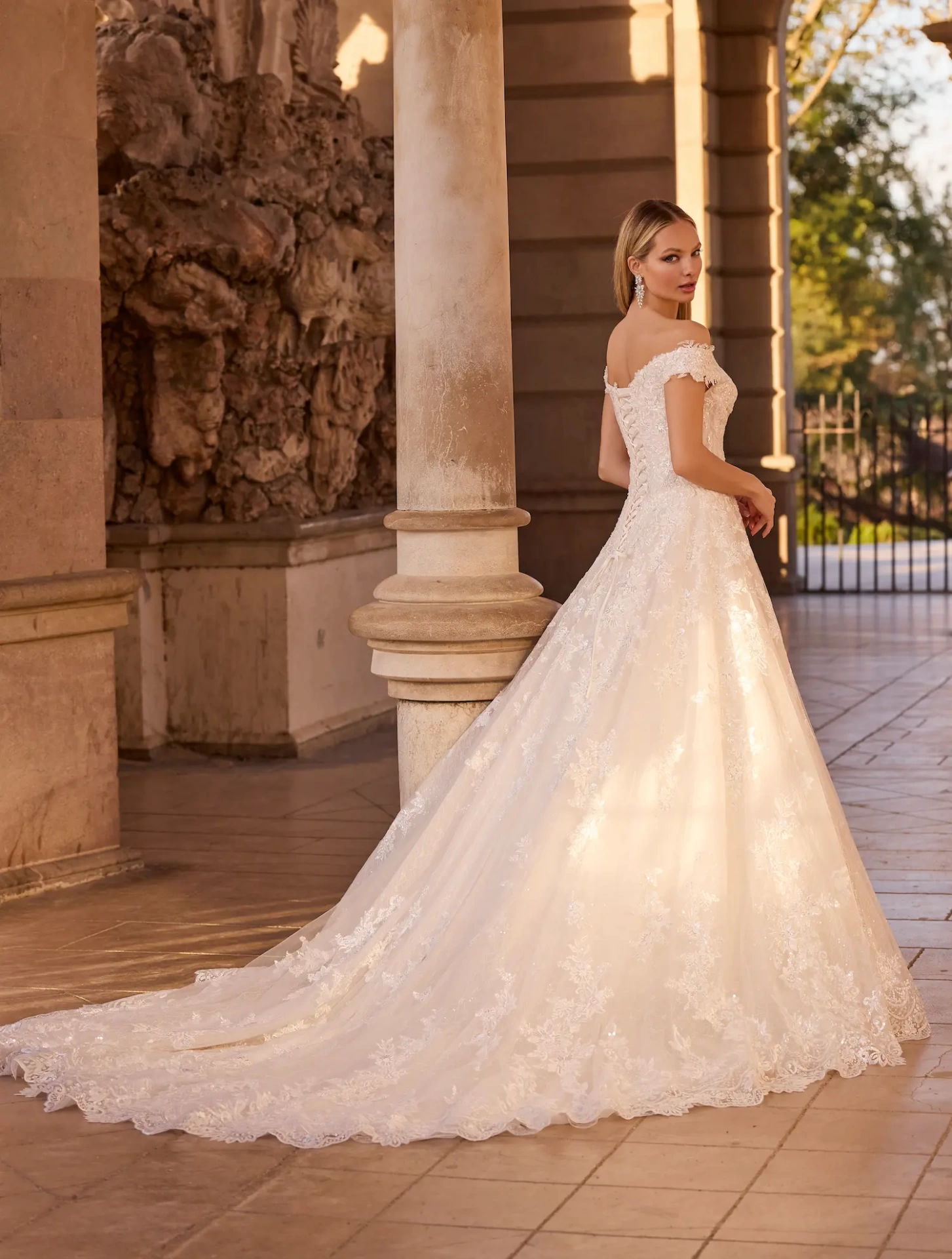 Il modello 63111, della Nuova Collezione Sposa firmata Veni Infantino, totalmente in pizzo unisce la raffinatezza di un corpino con spalle scese e scollatura a cuore, al fascino di una gonna ampia con strascico regale. Il pizzo floreale si intreccia armoniosamente al tulle, creando un effetto romantico e senza tempo. Sul retro, la chiusura a corsetto garantisce una vestibilità impeccabile.