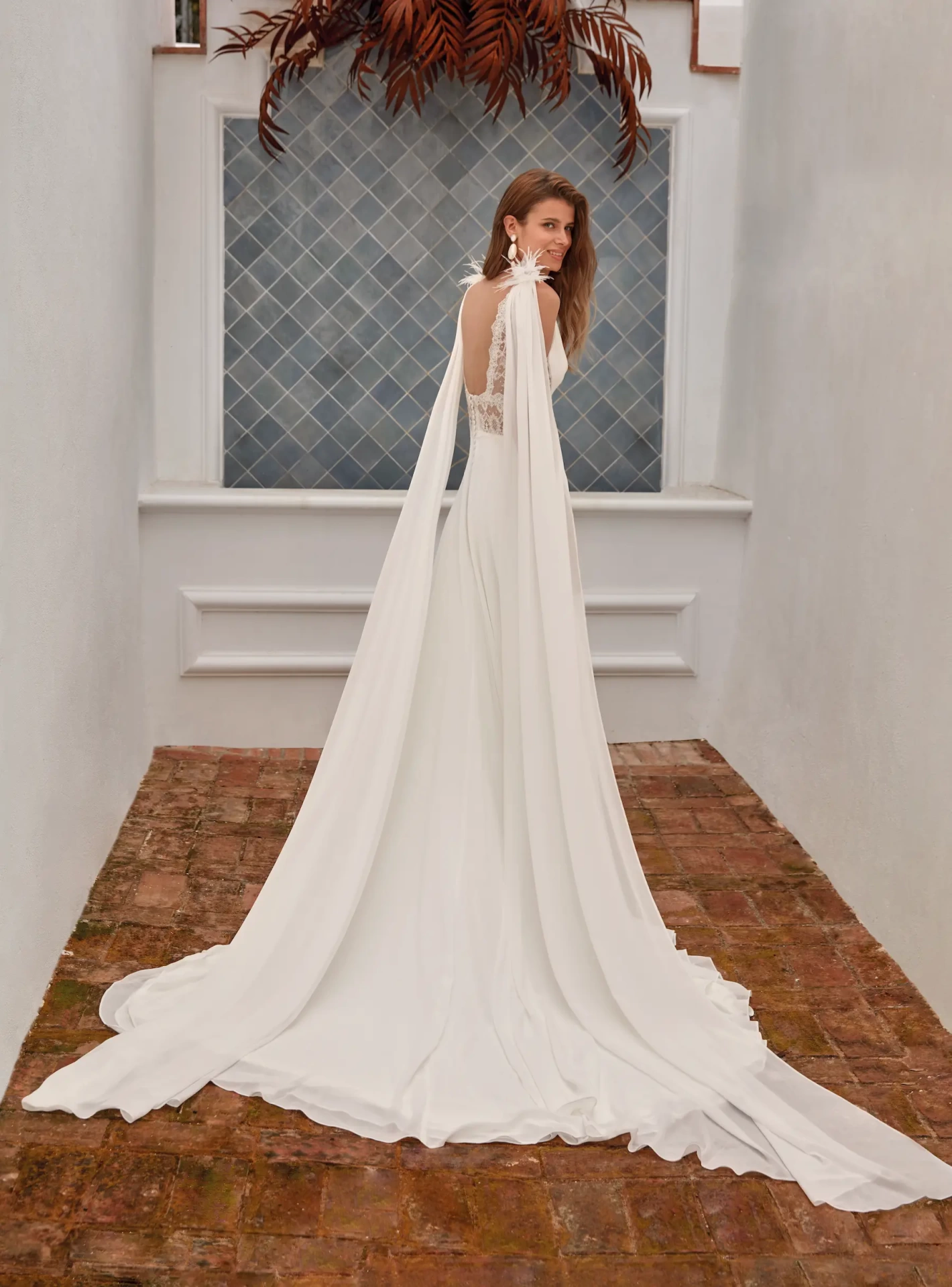 Sul retro, il corpetto in pizzo lascia intravedere la schiena, incorniciata da due morbidi drappeggi in chiffon che si trasformano in una coda fluente, creando un effetto mantella leggero e scenografico.