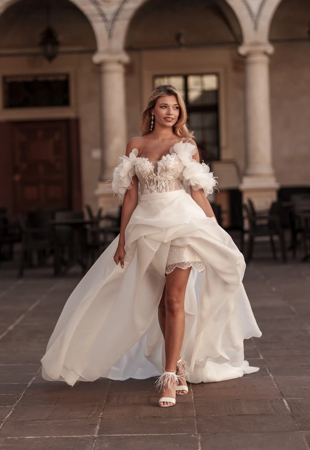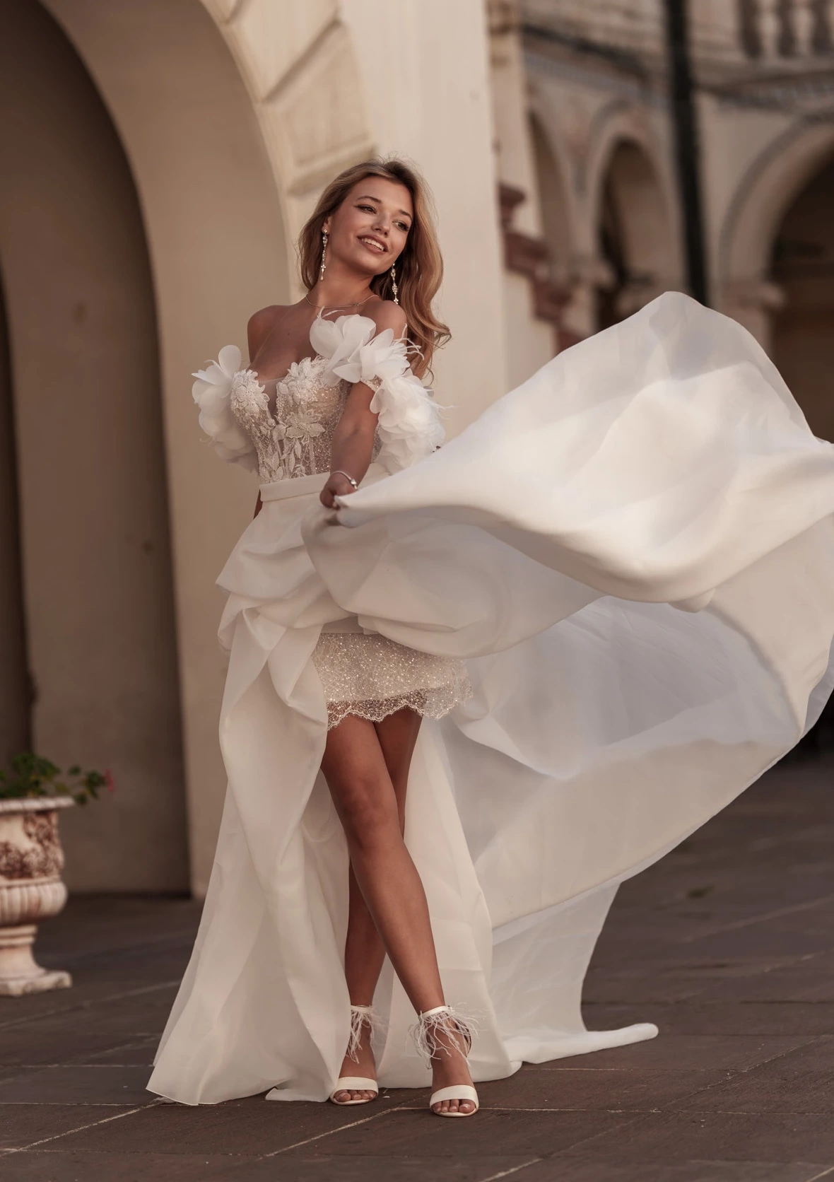 Il primo abito, con ampia gonna in mikado e applicazioni floreali sulle maniche, conquista con un allure romantico e scenografico. Il corpetto in pizzo trasparente e ricami 3D valorizza il décolleté con sensualità ed eleganza.Ma il vero colpo di scena arriva con il secondo look: un mini dress interamente ricamato in paillettes e perline, che trasforma la sposa in regina della festa. Perfetto per il party serale o per un cambio effetto sorpresa.Un abito, due anime: la poesia del sì e la leggerezza della celebrazione.