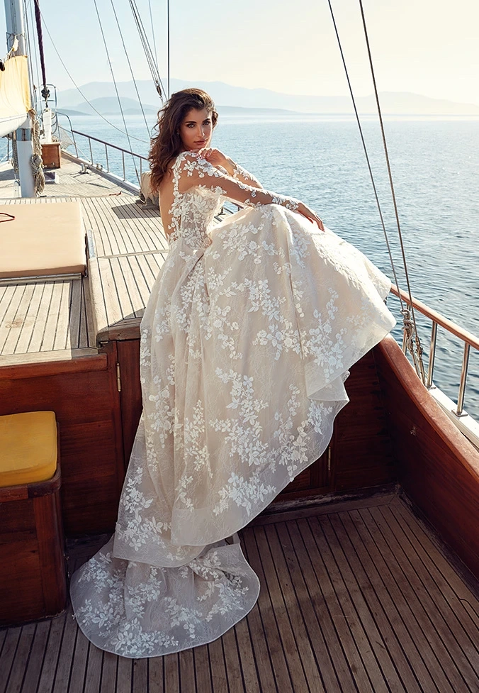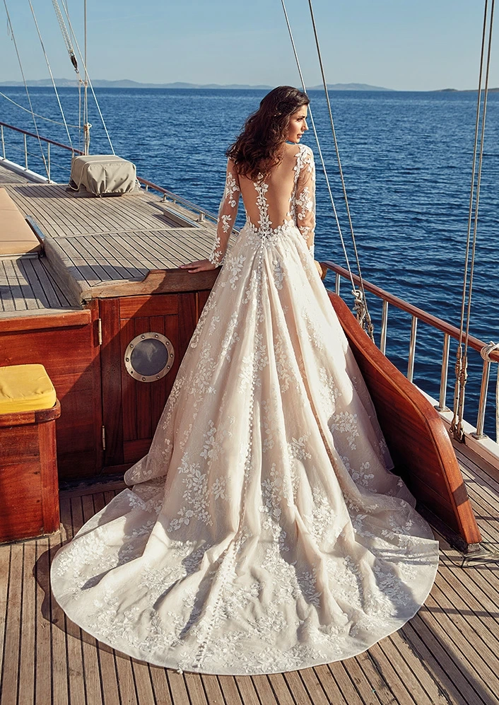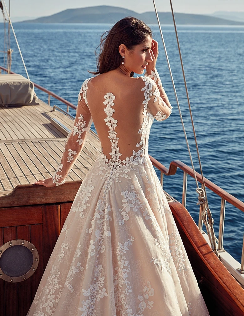 Il modello Donatella della Nuova Collezione Sposa è un capolavoro di eleganza romantica e audacia raffinata. Questo abito da sposa incanta con il suo corpetto interamente decorato da ricami floreali in pizzo, che si intrecciano delicatamente su un tulle trasparente, creando un effetto tattoo mozzafiato. Le maniche lunghe in tulle, anch’esse decorate da ricami floreali, avvolgono le braccia come un soffio leggero, donando al look un tocco di femminilità sofisticata. La gonna ampia in tulle e pizzo scivola dolcemente fino al suolo, creando un volume leggero e fluttuante, perfetto per una sposa che sogna un look da principessa moderna. Il retro dell’abito è una vera opera d’arte, con una profonda scollatura che svela delicatamente la schiena, incorniciata da ricami floreali che proseguono fino alla maestosa coda. Una fila di piccoli bottoni completa il look, aggiungendo un tocco di eleganza. E' la scelta perfetta per una sposa che sogna un matrimonio immerso nella natura o dal fascino senza tempo di una villa storica. Un abito che unisce il fascino classico del pizzo a un design moderno e audace.