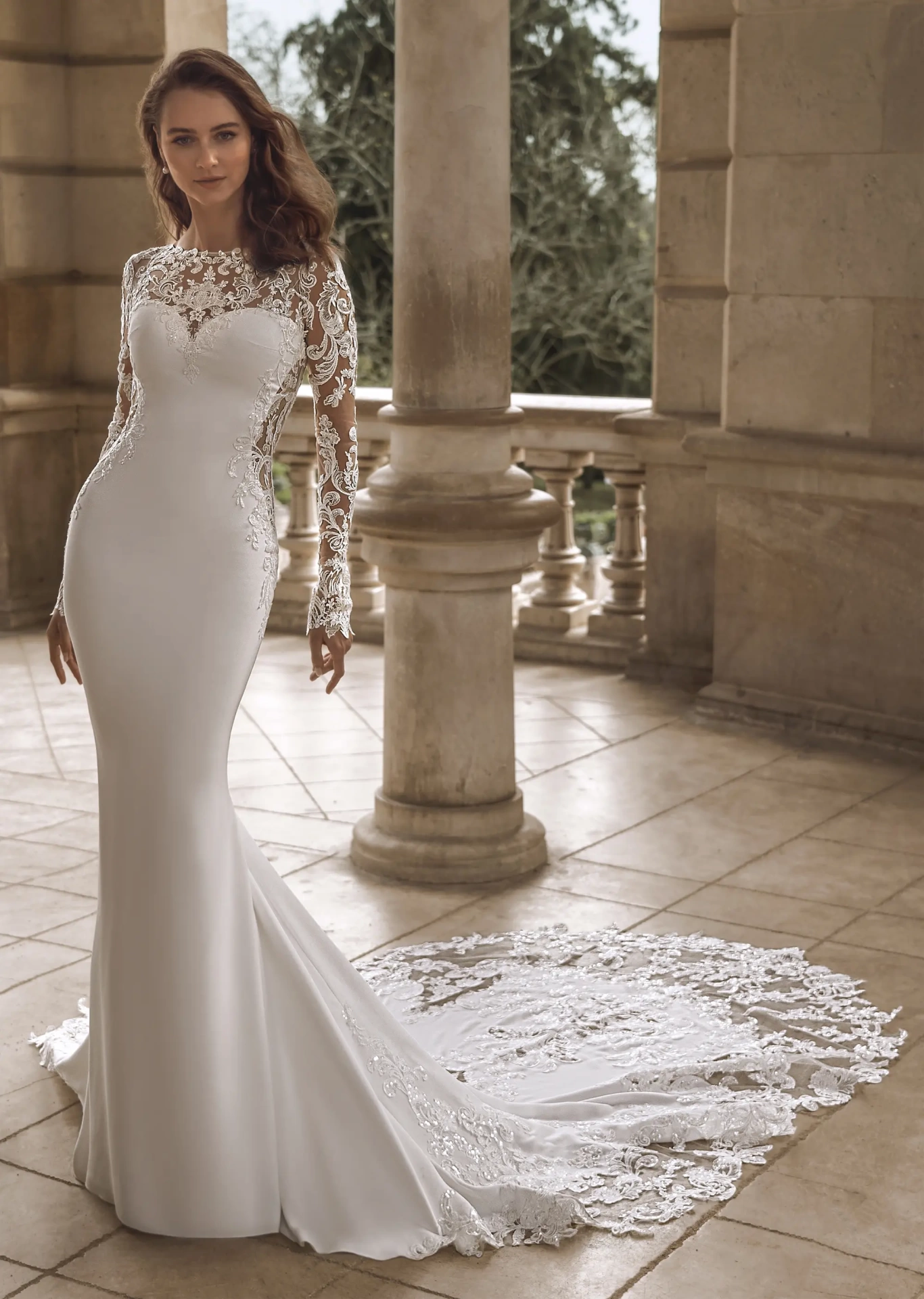 Il modello Felicia, della Nuova Collezione Sposa firmata Enzoani, è un abito da sogno per la sposa che desidera lasciare il segno con classe, sensualità e un'eleganza senza tempo. Il modello, interamente realizzato in crepe couture color seta, avvolge il corpo con una linea a sirena scolpita, fluida e impeccabile, valorizzando ogni curva con una grazia raffinata. Il punto luce è il corpino illusion, una seconda pelle di tulle trasparente interamente ricamata a mano con pizzo che disegna arabeschi floreali sulle braccia, sul décolleté e sulla schiena. Le maniche lunghe diventano preziosi gioielli ricamati, mentre lo scollo alto e la schiena nude conferiscono un allure regale e seducente. Lo sguardo si perde nel sontuoso strascico regale che esplode in una composizione scenografica da vera protagonista. Un abito pensato per matrimoni da favola, tra architetture storiche, scalinate scenografiche e atmosfere da red carpet. Perfetto per la sposa che sogna un'entrata maestosa e un look senza tempo, memorabile e incantevole.