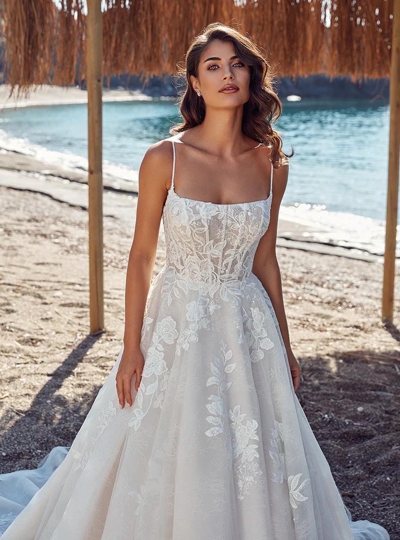 Il modello Fiorentina della Nuova Collezione Sposa è un vero inno al romanticismo e alla raffinatezza. Il corpetto, strutturato e avvolgente, è arricchito da eleganti ricami floreali che donano profondità e preziosità al tessuto. Le sottili spalline incorniciano delicatamente le spalle, mentre la scollatura squadrata valorizza il décolleté con un tocco di femminilità sofisticata. La gonna ampia e voluminosa scende maestosa, impreziosita da ricami che si fondono armoniosamente con il tessuto, creando un effetto di grande impatto visivo. La parte posteriore dell’abito mantiene la stessa eleganza imponente, con un corsetto che segue dolcemente la linea della schiena, arricchito da dettagli in pizzo che esaltano la silhouette. Lo strascico è importante e scenografico, decorato con ricami floreali che proseguono dalla vita fino all’orlo, donando un effetto principesco e raffinato.Un abito perfetto per una sposa che desidera un look romantico e fiabesco, capace di lasciare senza fiato.