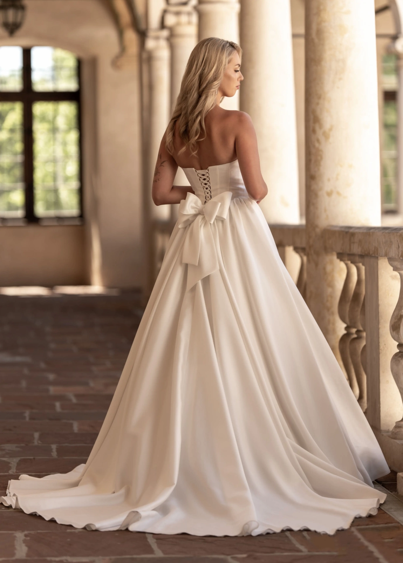 L’abito da sposa FLORINA, della Nuova Collezione Sposa firmata MS, celebra la bellezza della purezza e delle linee pulite. Il corpino strutturato, con scollo a cuore drappeggiato e dettaglio centrale, valorizza il décolleté con estrema grazia. La gonna ampia in mikado scivola fluida in una silhouette principesca ma moderna, mentre il retro con allacciatura a corsetto e un raffinato fiocco dona un tocco bon ton e romantico. Un abito che unisce essenzialità e scenografia in un perfetto equilibrio. Ideale per la sposa elegante e decisa, che sogna un matrimonio raffinato in villa, in castello o in una location dall’anima classica.