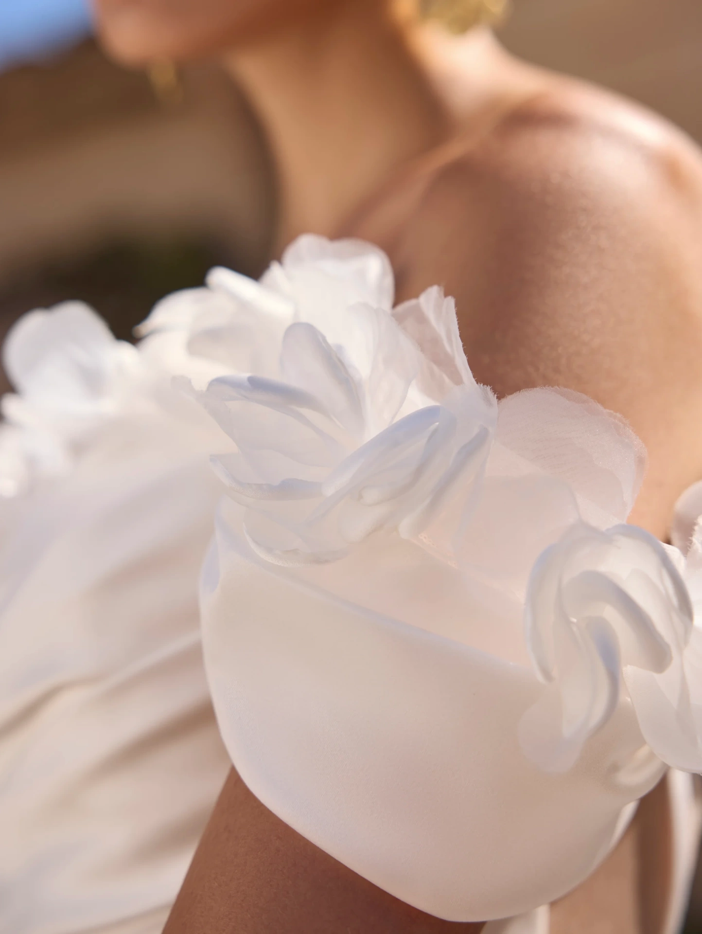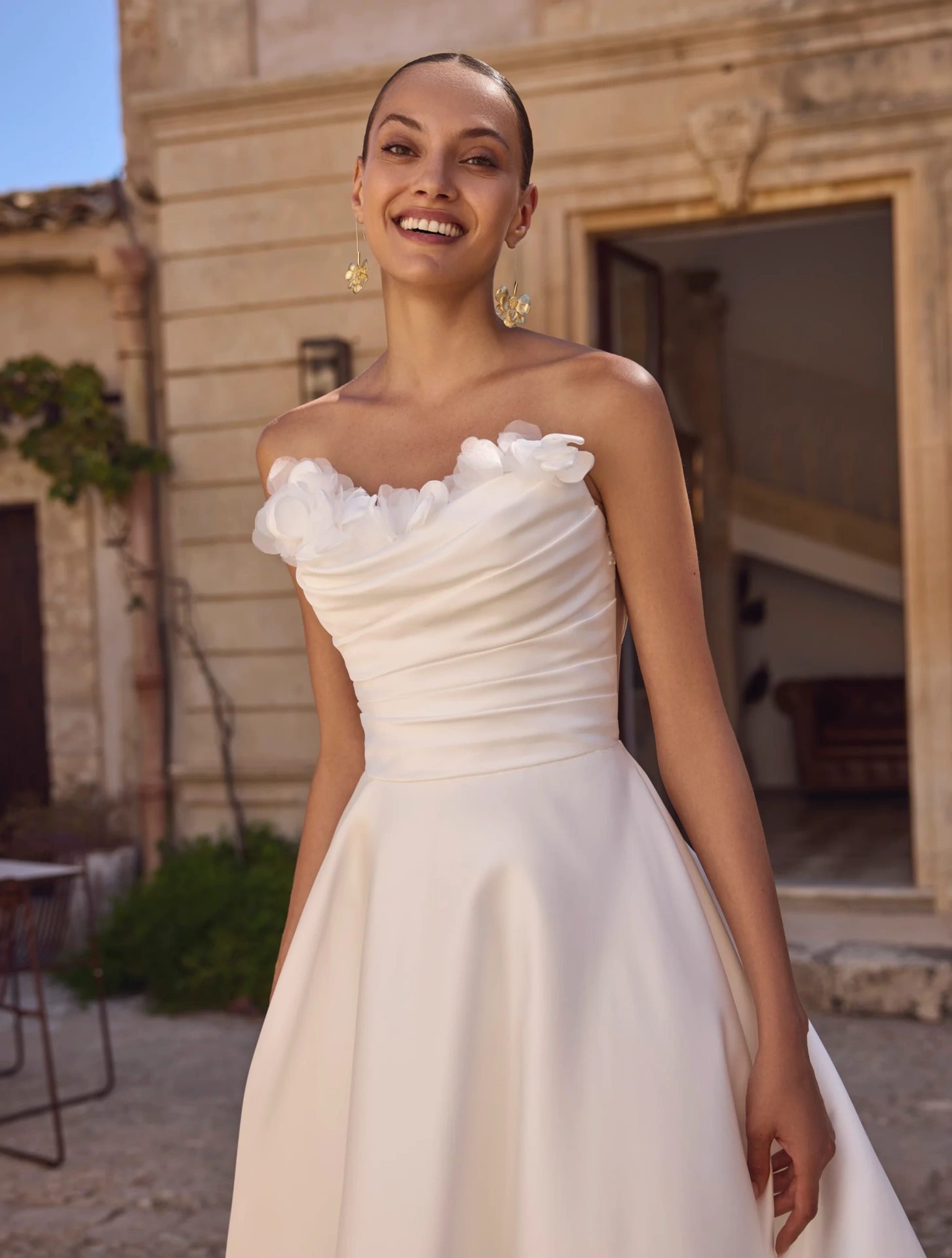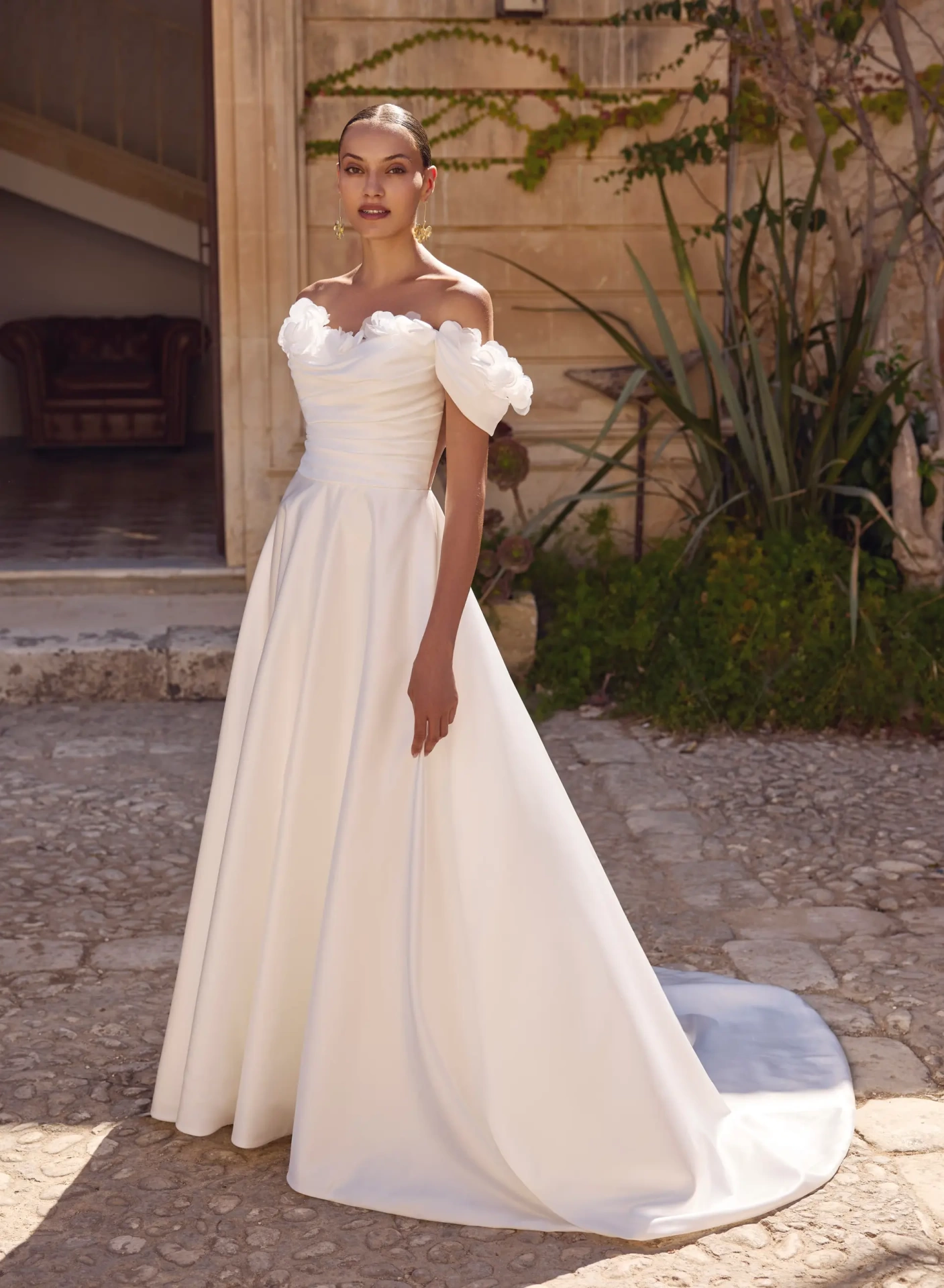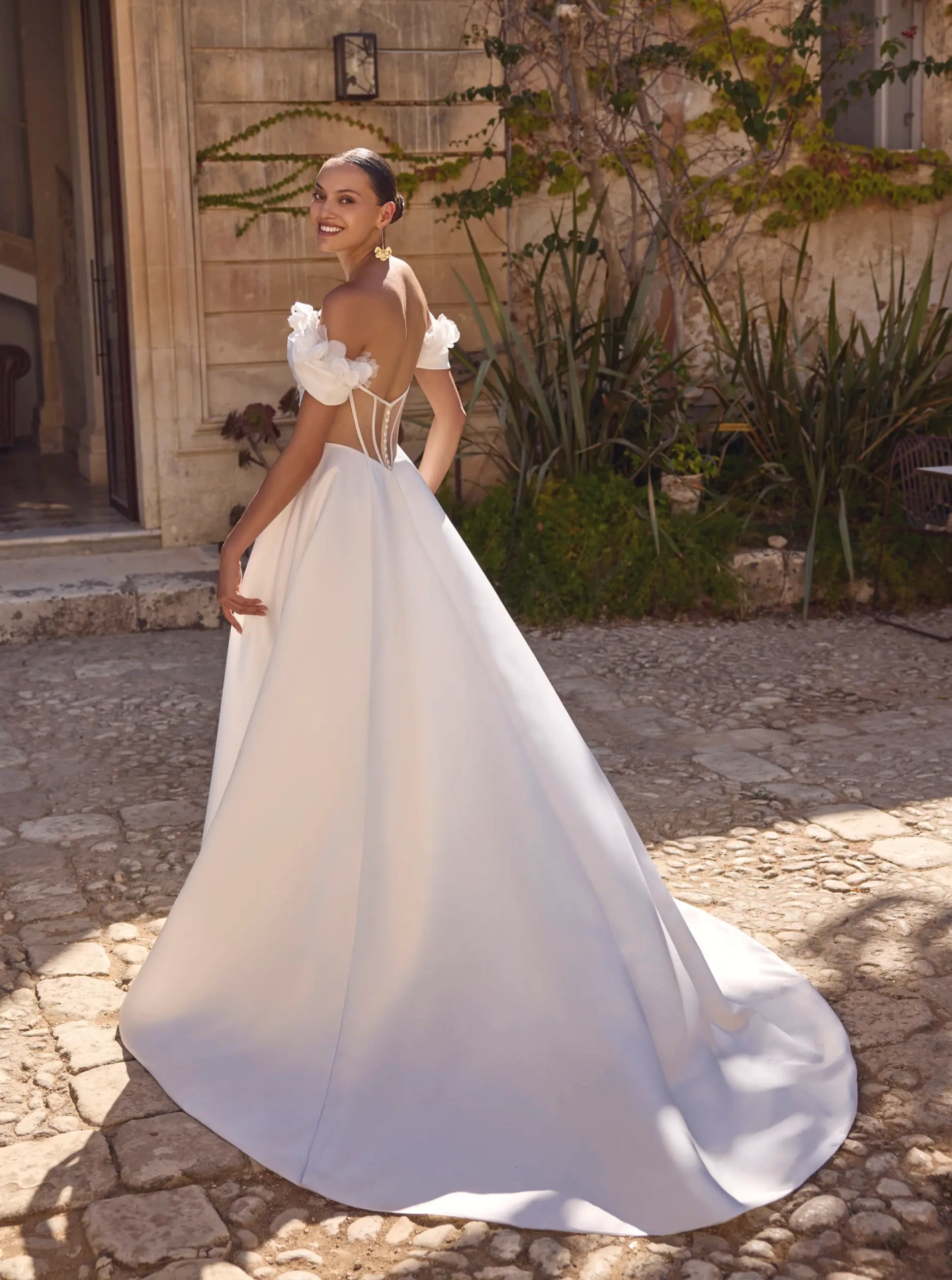 Il modello Geri, della Nuova Collezione Sposa firmata Modeca,Un abito che racchiude l’eleganza più autentica con un tocco moderno e sofisticato. Realizzato in mikado di seta, GERI conquista con il suo corpetto drappeggiato che abbraccia il busto con delicatezza, arricchito da romantiche applicazioni floreali tridimensionali sul décolleté e sulle maniche off-the-shoulder.Il retro sorprende con un corsetto trasparente dal design couture che esalta il punto vita e aggiunge una nota sensuale, bilanciata dalla purezza della gonna ampia e fluida, dal taglio impeccabile.Perfetto per la sposa che sogna un look regale, essenziale e insieme ricercato.