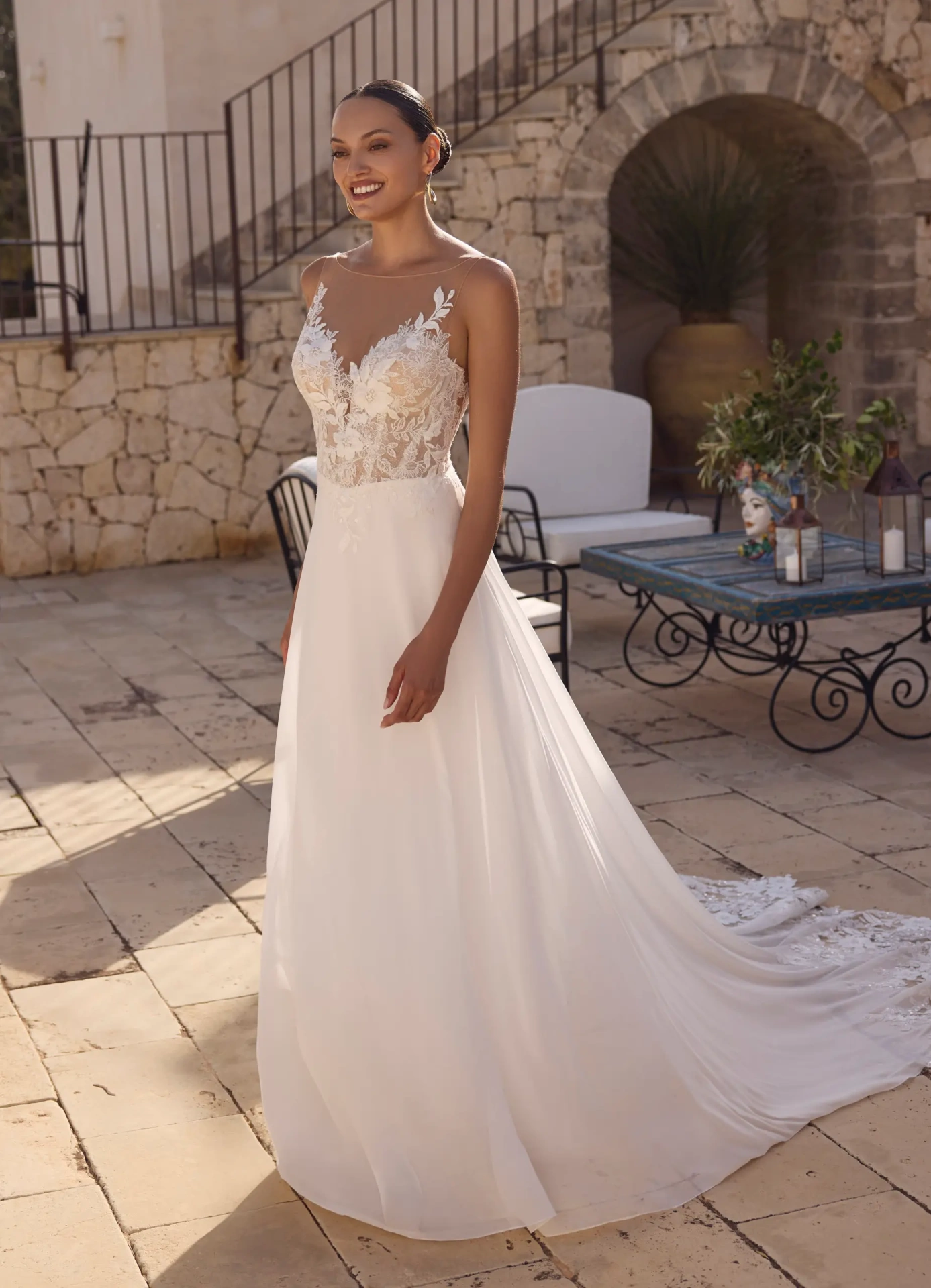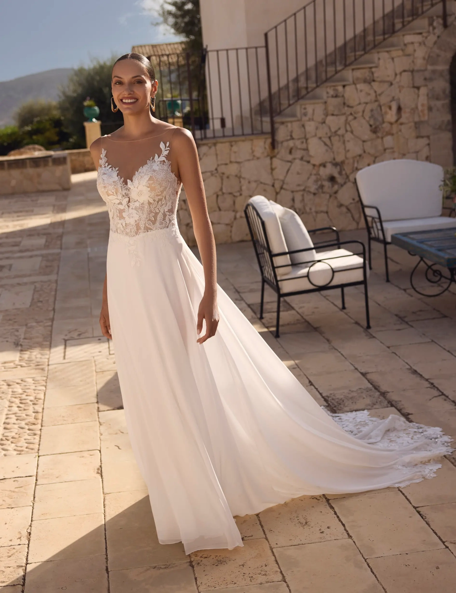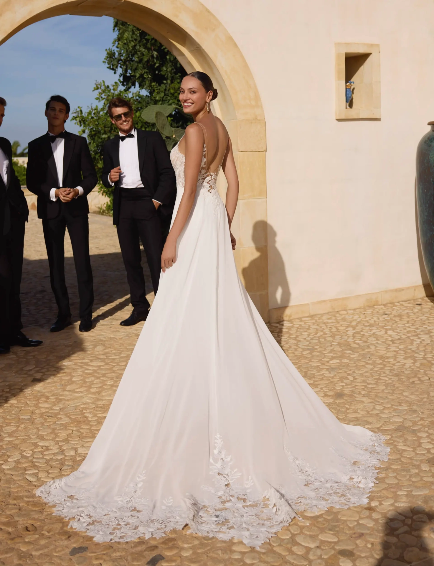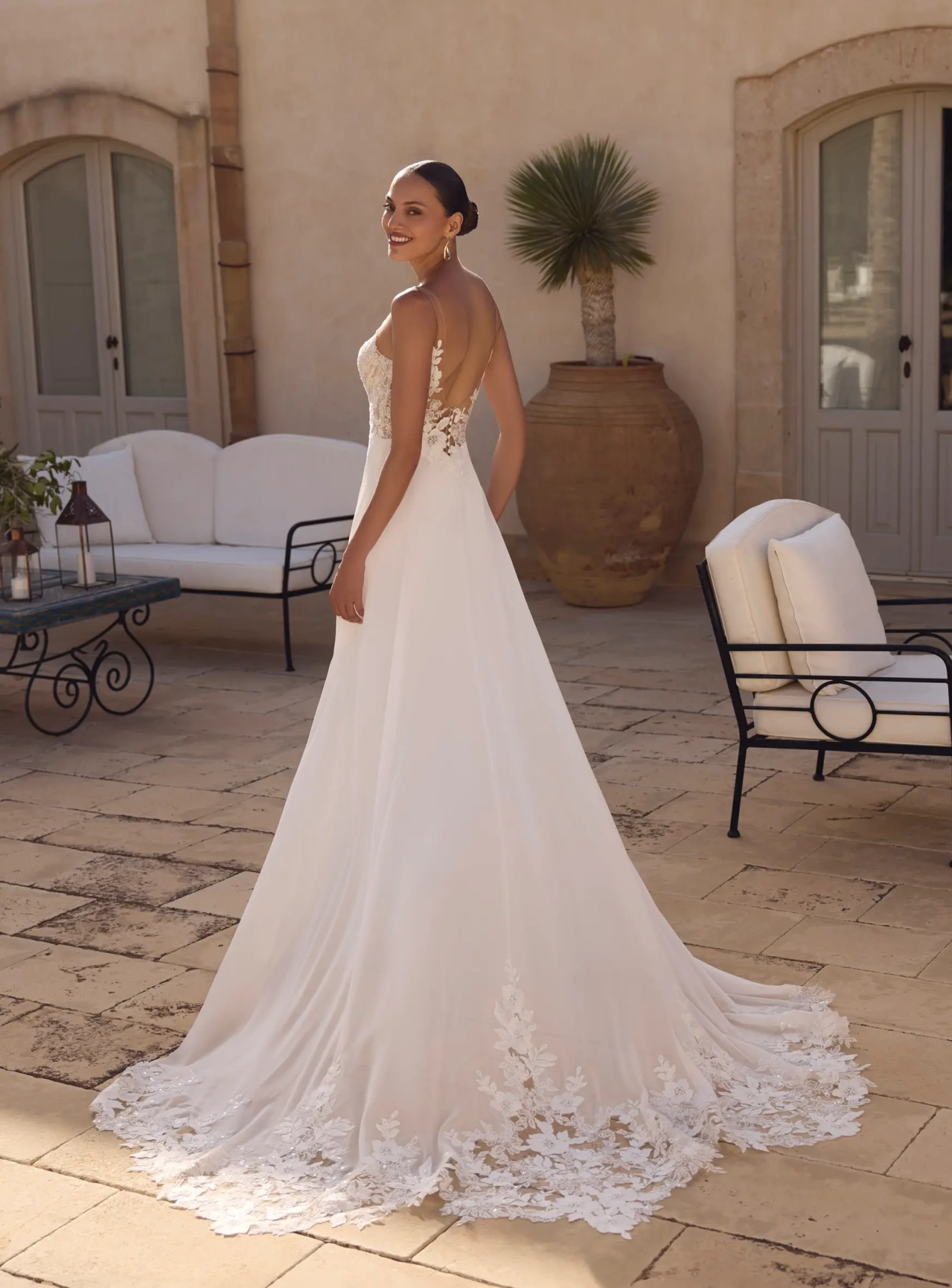 La gonna in chiffon, morbida e fluida, accarezza i movimenti con eleganza, mentre lo strascico rifinito in pizzo aggiunge un tocco finale da sogno.
