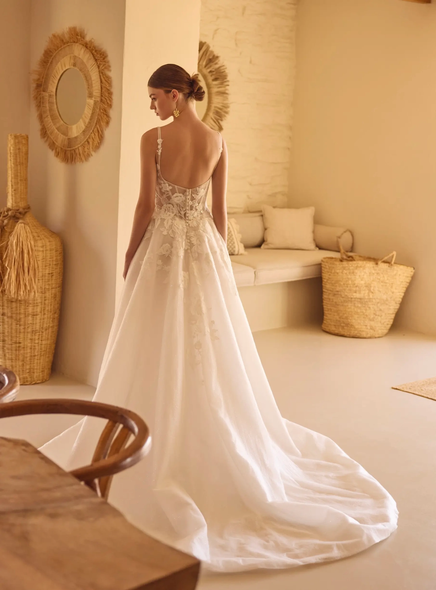 Il modello Hetty, della Nuova Collezione Sposa firmata Modeca, è un abito romantico e raffinato, pensato per valorizzare con grazia la silhouette femminile. Il corpino in tulle trasparente, ricamato con eleganti motivi floreali, si abbina perfettamente alle sottili spalline e al carré squadrato, regalando un tocco moderno e sofisticato. La gonna ampia in tulle scintillante si apre in una vaporosa linea A, culminando in un lungo strascico che incanta ad ogni passo. Un modello perfetto per la sposa che cerca un equilibrio tra delicatezza, eleganza e uno stile ricercato.