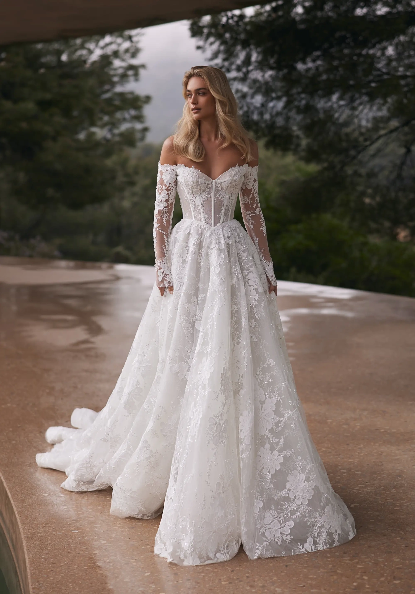 Immagina un abito che non sia solo da indossare, ma da vivere: modello Hugo, della Nuova Collezione Sposa firmata Eva Lendel. Questo modello esclusivo rappresenta l’apice della raffinatezza: un'opera d'arte sartoriale realizzata in pizzo florelae ricamato a mano con delicate applicazioni luminose che accarezzano ogni movimento. Il corpino, semi-trasparente e strutturato, avvolge con sensualità la figura, mettendo in risalto le spalle con uno scollo a cuore off-shoulder dal taglio impeccabile. Le maniche lunghe in pizzo illusion proseguono in un disegno floreale tridimensionale che si fonde con la silhouette come un ricamo su pelle. La gonna, ampia ma leggera, si apre in una cascata di luce e ricami, scivolando sul pavimento con una maestosità che conquista ogni sguardo. Il corpetto stringato sul retro aggiunge un tocco romantico e senza tempo. Perfetto per una sposa che desidera sentirsi regale, irripetibile e indimenticabile, in un abito che parla il linguaggio dell’eccellenza.