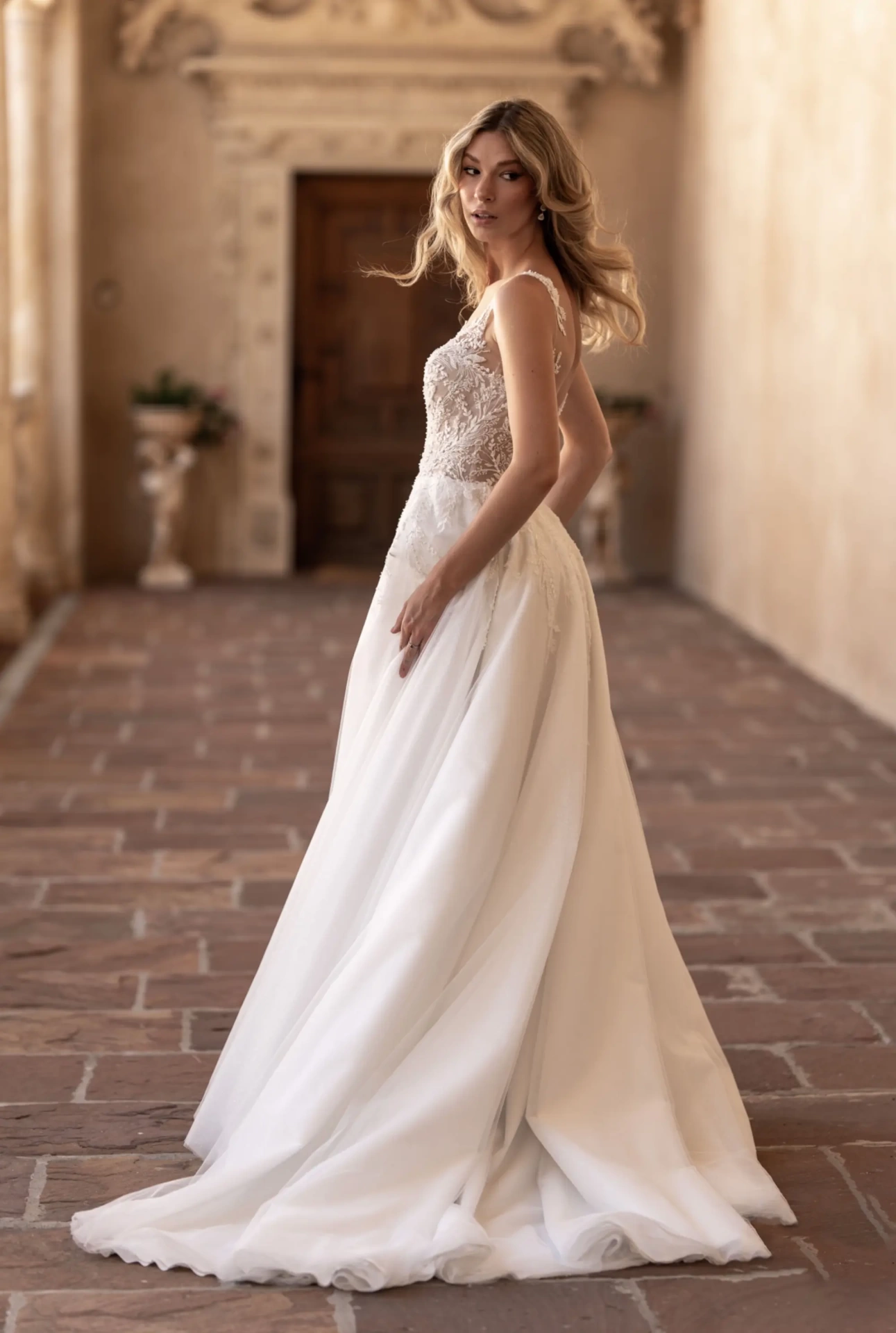 Il modello Jessamine, della Nuova Collezione Sposa firmata Ms, è un abito etereo e luminoso, per la sposa che ama la leggerezza senza rinunciare allo splendore dei dettagli. Il corpino semi-trasparente è interamente ricamato con delicate perline e micro perle, che disegnano eleganti motivi floreali sulle spalline e sulla schiena effetto tattoo, regalando luce e raffinatezza. La gonna in tulle soft, ampia e vaporosa, si apre in uno spacco frontale audace e sofisticato, perfetto per valorizzare la figura con grazia. Ideale per una sposa romantica, contemporanea e innamorata dei dettagli preziosi.