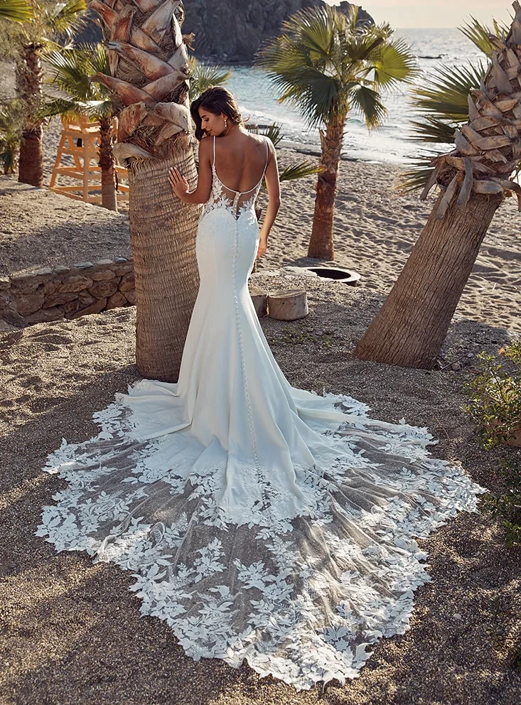 Il modello Laguna della Nuova Collezione Sposa è l’essenza della sensualità raffinata e dell’eleganza imponente. Un abito da sposa che non passa inosservato, perfetto per una sposa che desidera sentirsi una visione mozzafiato. Il corpetto, con una profonda scollatura a V, è un capolavoro di femminilità, sorretto da sottili spalline ricamate che aggiungono un tocco di luce. I ricami floreali si intrecciano sul busto, abbracciando dolcemente la figura e disegnando linee che slanciano la silhouette.Ma è la coda a fare la differenza: una coda imponente e spettacolare, interamente decorata da ricami in pizzo che ondeggiano come una scia di magia ad ogni passo. Una vera e propria dichiarazione di stile, pensata per una sposa che vuole lasciare un segno indelebile.Il retro dell’abito è un sogno a occhi aperti, con una scollatura trasparente che rivela la schiena e ricami che sembrano fluttuare sulla pelle. Una fila di piccoli bottoni aggiunge un tocco di eleganza classica, fondendosi con la modernità di un design che seduce e conquista. E' l’abito ideale per una sposa che non teme di brillare, perfetto per una cerimonia da sogno su una spiaggia dorata, in una villa esclusiva o in una sontuosa sala da ballo. Ogni dettaglio racconta una storia di passione, bellezza e audacia.