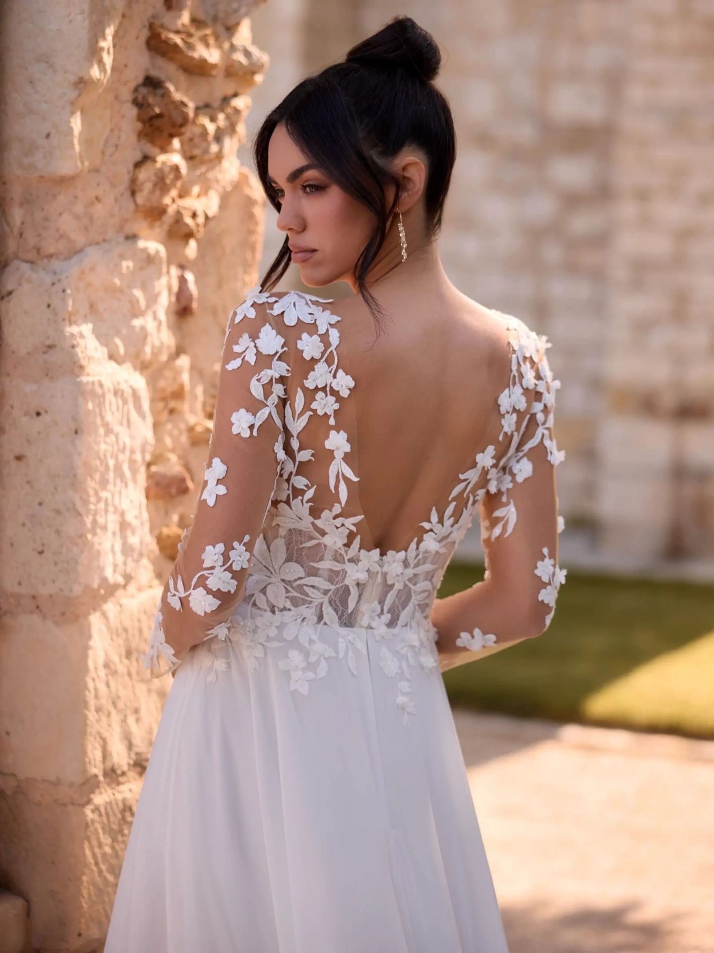 Un abito da sposa leggerissimo pensato per la sposa che desidera libertà di movimento, romanticismo e sensualità discreta. Questo modello unisce un corpino in pizzo floreale tridimensionale a una gonna fluida in chiffon impalpabile, creando un perfetto equilibrio tra struttura e leggerezza. Il bustino presenta un raffinato scollo a V profondo con trasparenze delicate, valorizzato da applicazioni floreali che si adagiano naturalmente sulla pelle. Le maniche lunghe in tulle ricamato donano eleganza e femminilità, ideali per matrimoni primaverili ed estivi ma perfette anche per cerimonie autunnali dal gusto boho-chic. La gonna scivola morbida lungo la silhouette, aprendosi in un sensuale spacco laterale che slancia la figura e dona movimento ad ogni passo. Il retro è uno dei dettagli più suggestivi: una schiena profonda incorniciata da ricami floreali che creano un effetto tattoo romantico e sofisticato. La coda leggera completa il design senza appesantire, rendendo questo abito perfetto anche per destination wedding, matrimoni in villa, agriturismo o cerimonie all’aperto.