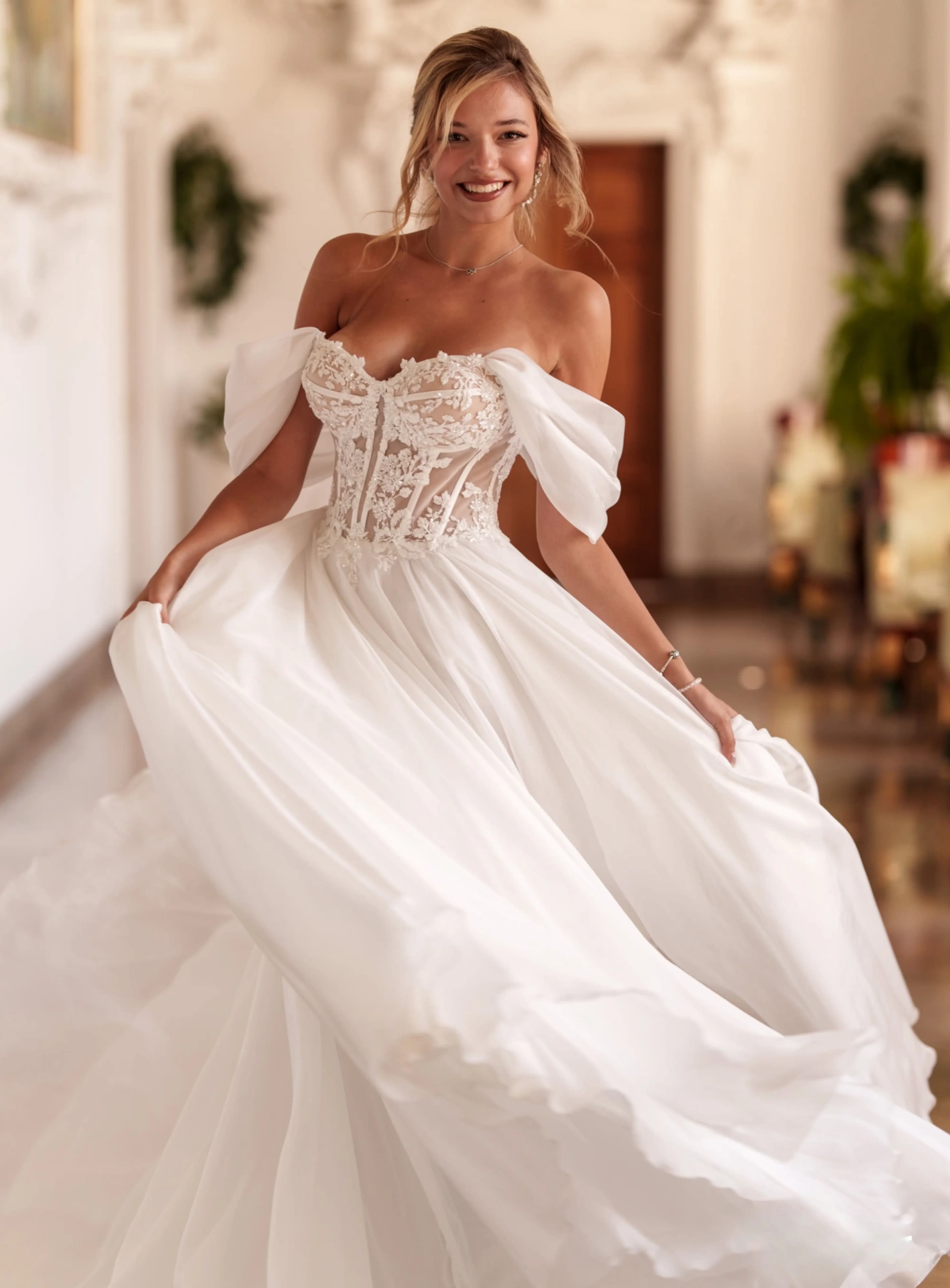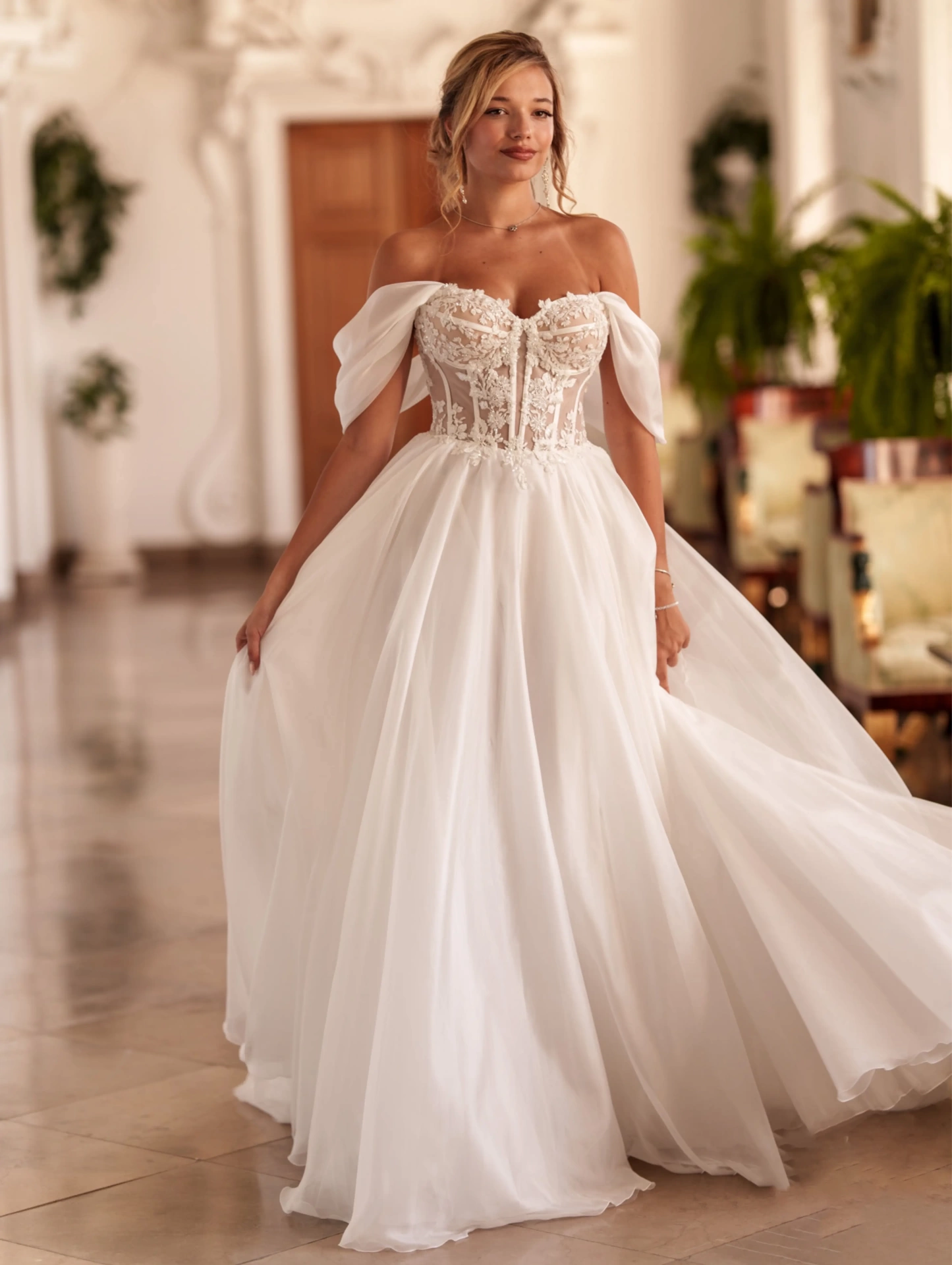 L’abito da sposa LUCIA, della Nuova Collezione Sposa firmata MS, unisce la leggerezza dell'organza alla sensualità del corpino effetto nude, creando un look sofisticato. Il bustino strutturato, con ricami floreali in rilievo e stecche a vista, disegna la silhouette con grazia, mentre le maniche scivolate in voile aggiungono un tocco delicato e sognante. La gonna ampia, fluida e leggera, si apre in morbidi volumi che donano movimento e un’allure principesca. Il retro, con romantica allacciatura a corsetto, garantisce una vestibilità perfetta e un dettaglio scenografico di grande impatto. Ideale per la sposa romantica e decisa, che desidera sentirsi regale ma leggera, perfetta per nozze in dimore storiche, ville d’epoca o castelli incantati.