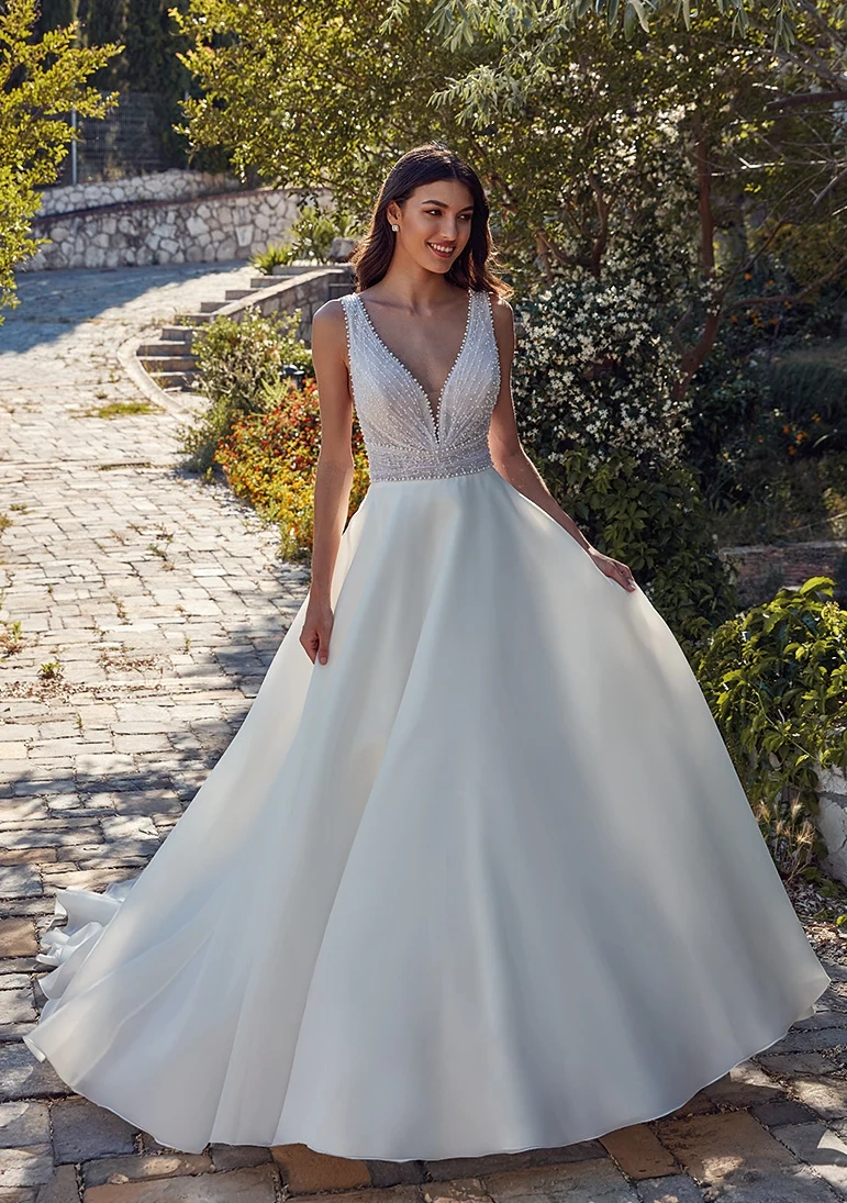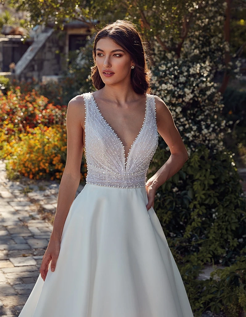 Il modello Margot della Nuova Collezione Sposa unisce sofisticatezza e luminosità. Il corpetto, caratterizzato da una profonda scollatura a V, è decorato con un ricamo di perline scintillanti che aggiungono un tocco di luce e raffinatezza. Le spalline e il taglio aderente mettono in risalto il décolleté e la linea delle spalle. La gonna, in un pregiato tessuto di organza liscia, scivola con eleganza, creando un contrasto perfetto tra la ricchezza del busto e la purezza del tessuto.